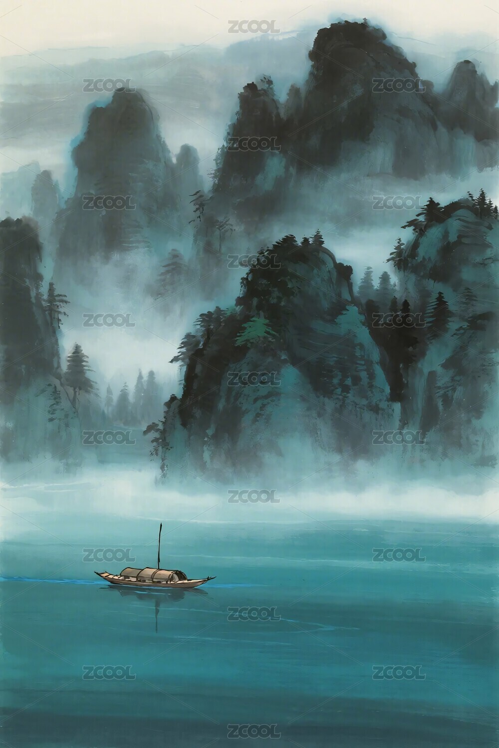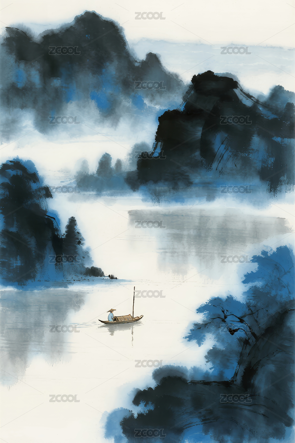 山水,水墨,湖泊,小船,树木,山峦,山水画,国画,风景,意境