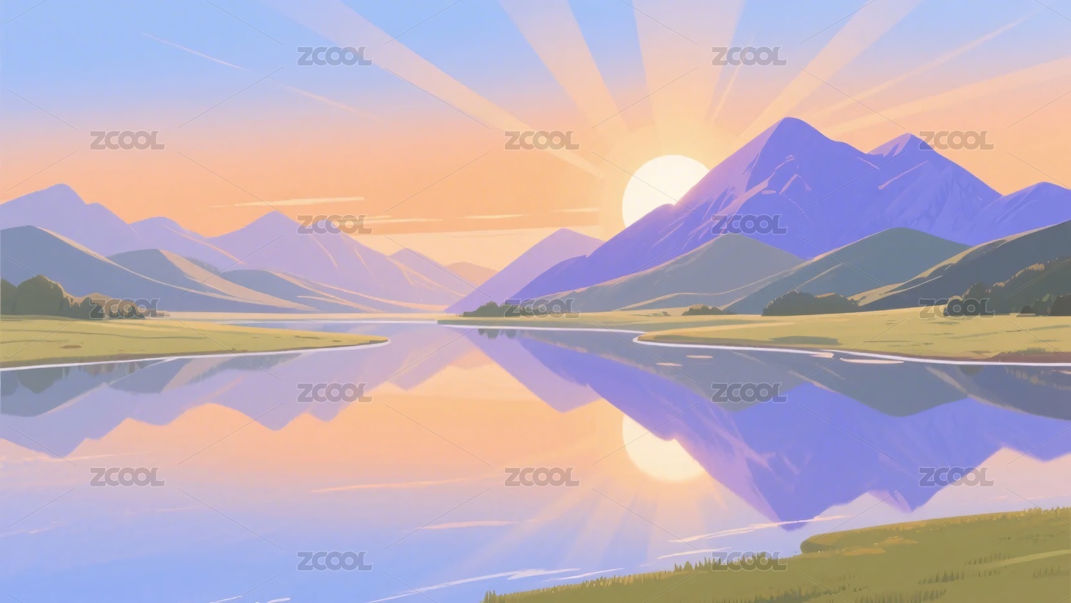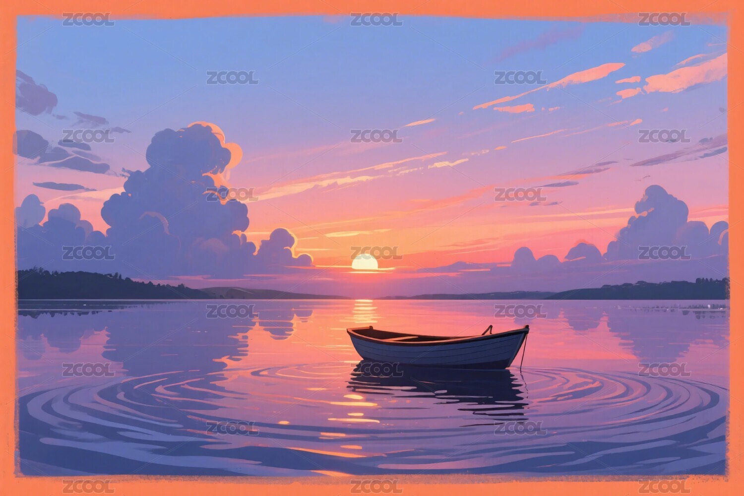 湖泊,小船,夕阳,山峦,水面,倒影,风景,插画,风景画,自然