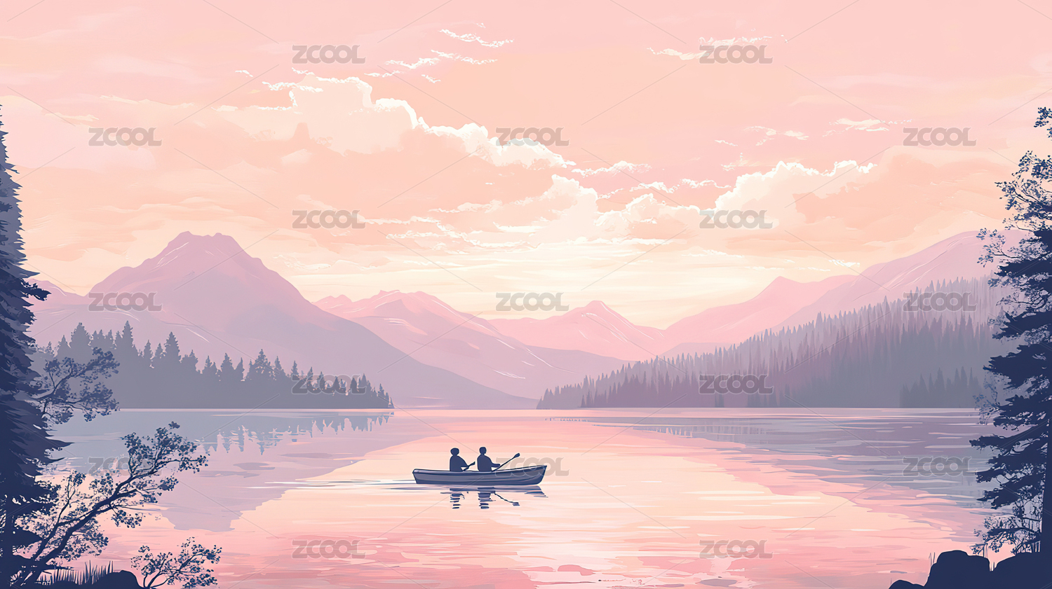 山水湖景划船插画