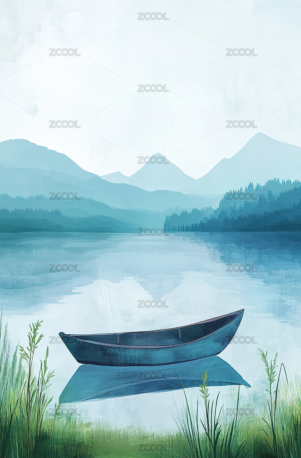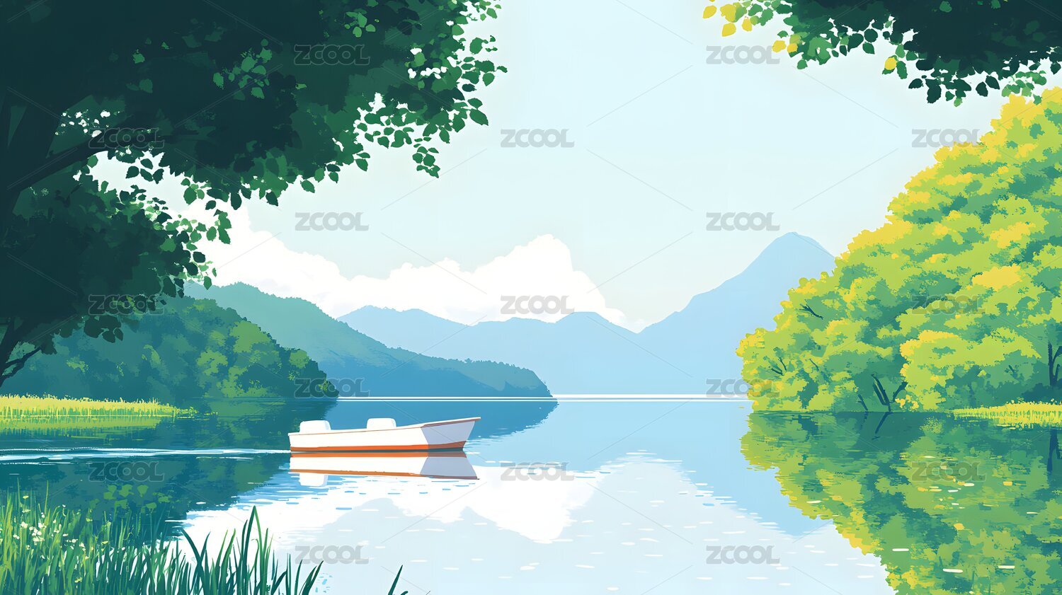 山水湖泊小船插画