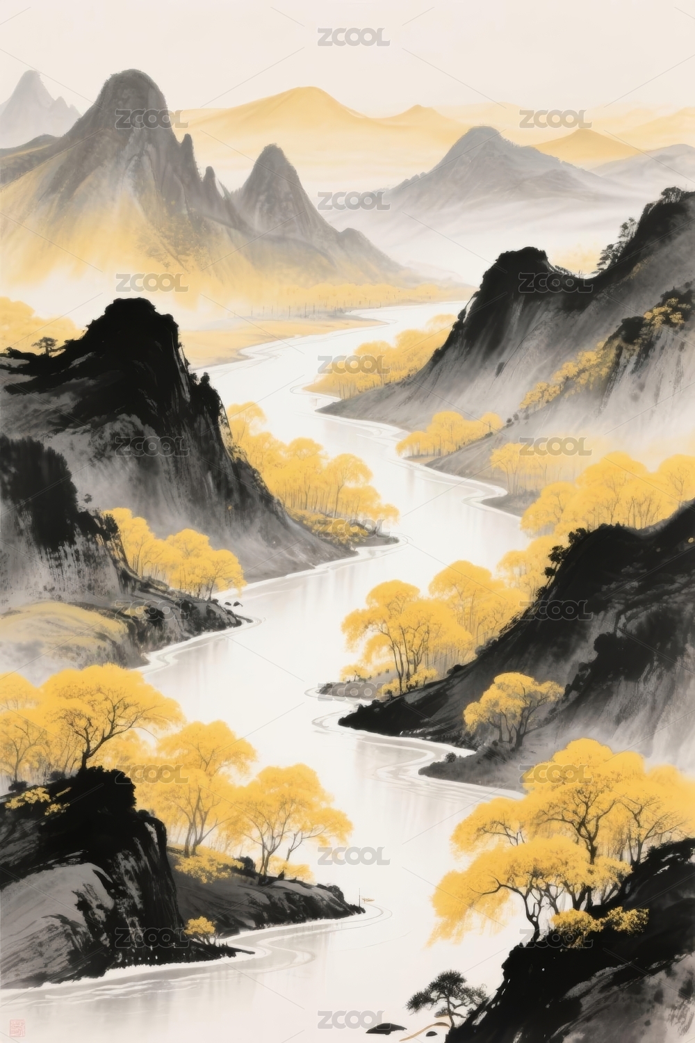 山间红叶水墨意境秋山红树云雾缭绕山水国画