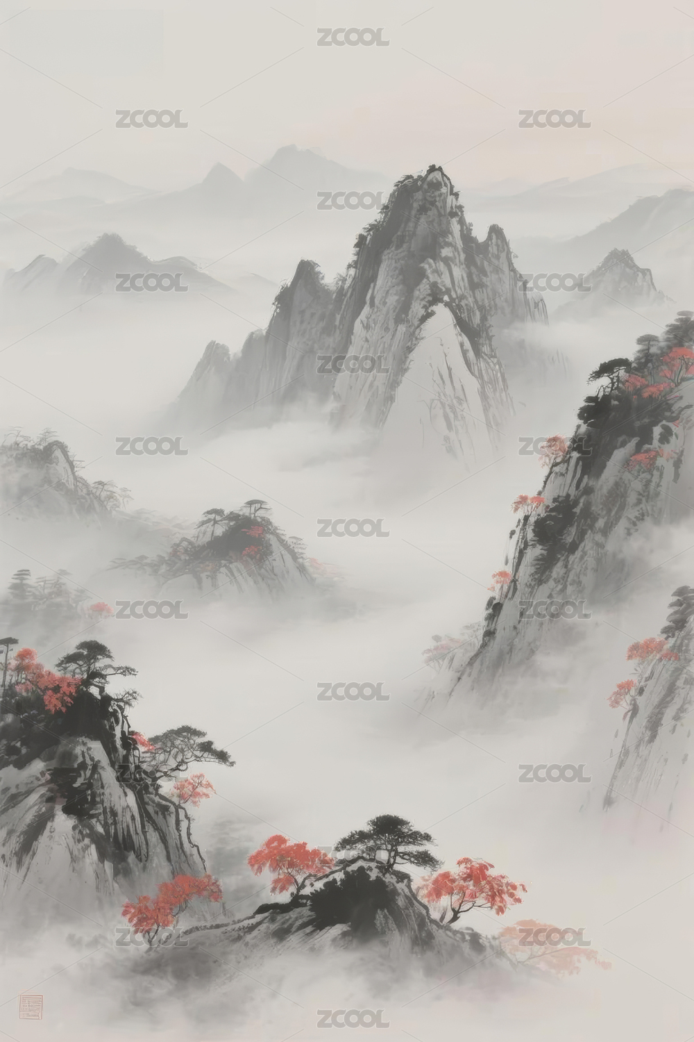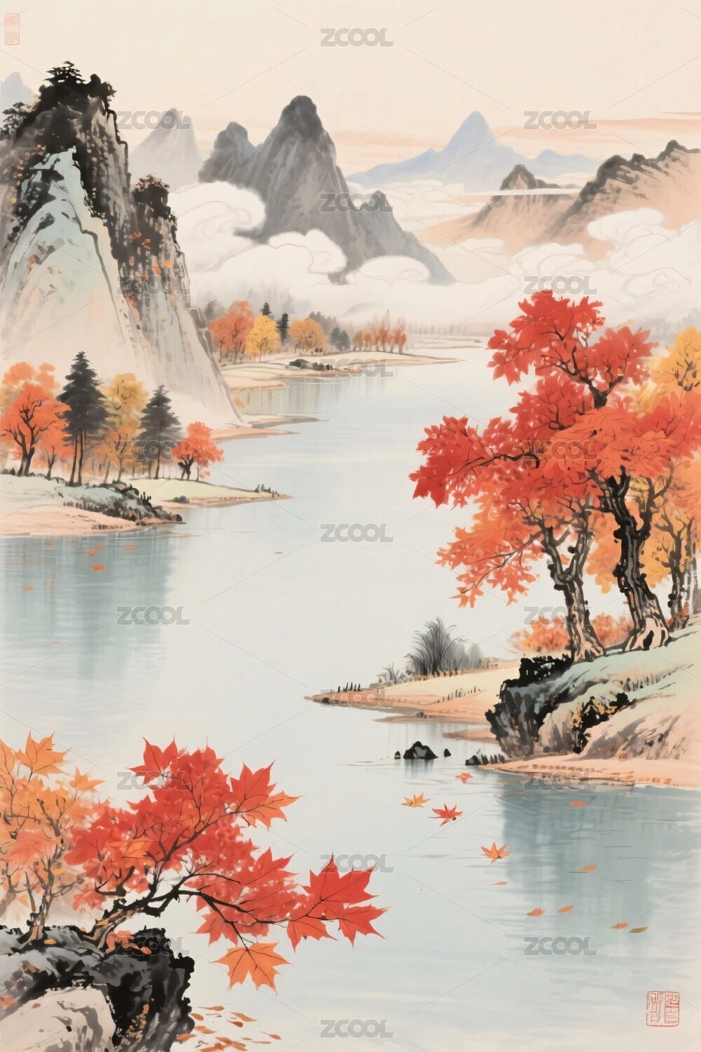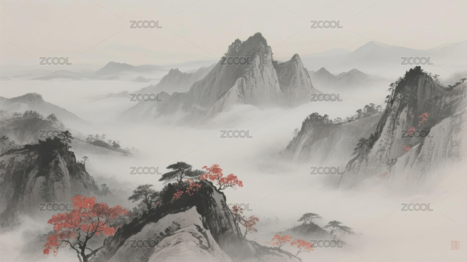 山水,山峦,红叶,树木,云雾,水墨,国画,风景,自然,红色