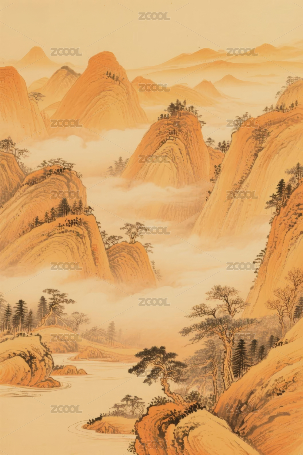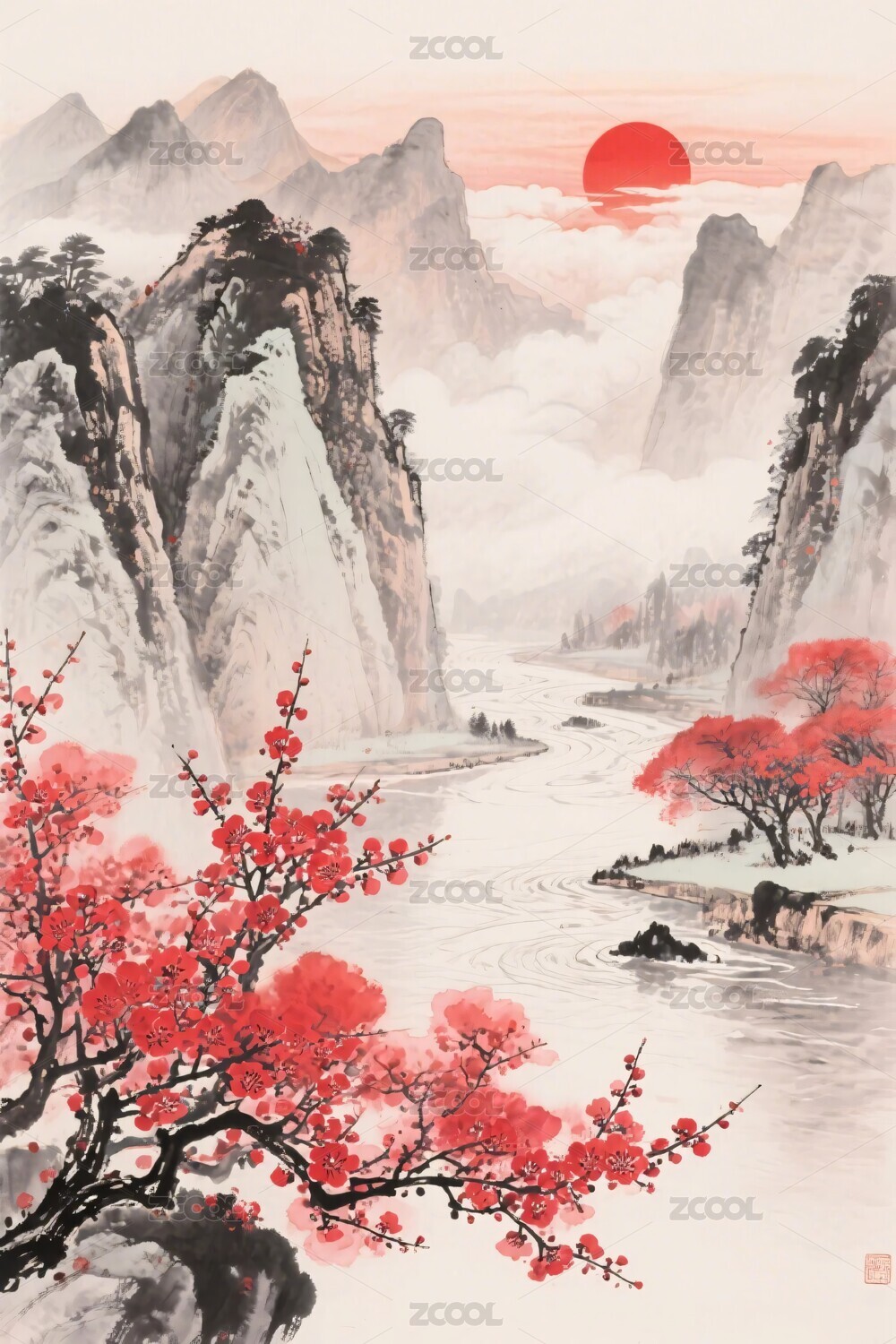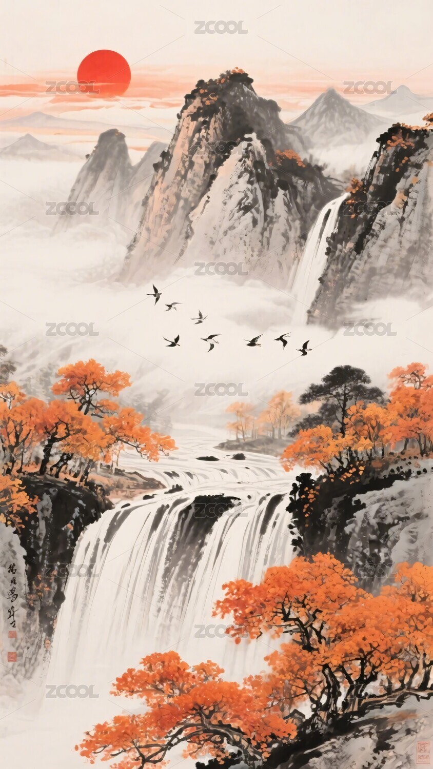 山水,山峦,红叶,树木,云雾,水墨,国画,风景,自然,红色