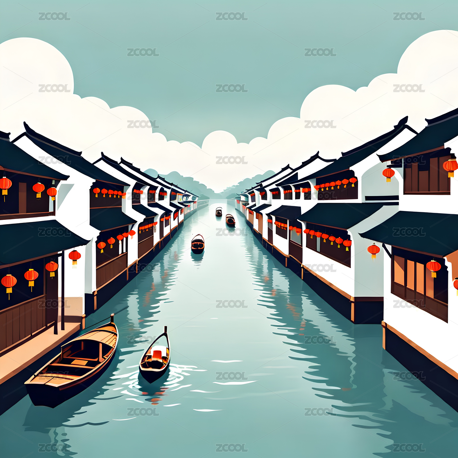 插画,建筑,河流,城市,天空,古镇,房屋,屋顶,景观,中国风