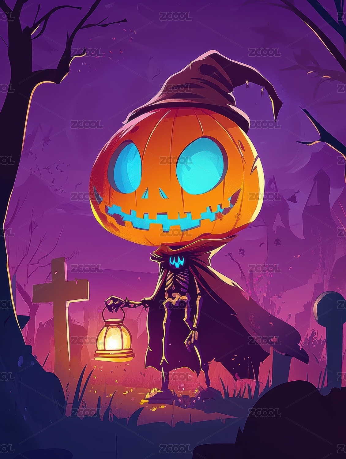 万圣节插图可爱提灯幽灵游荡夜间墓园