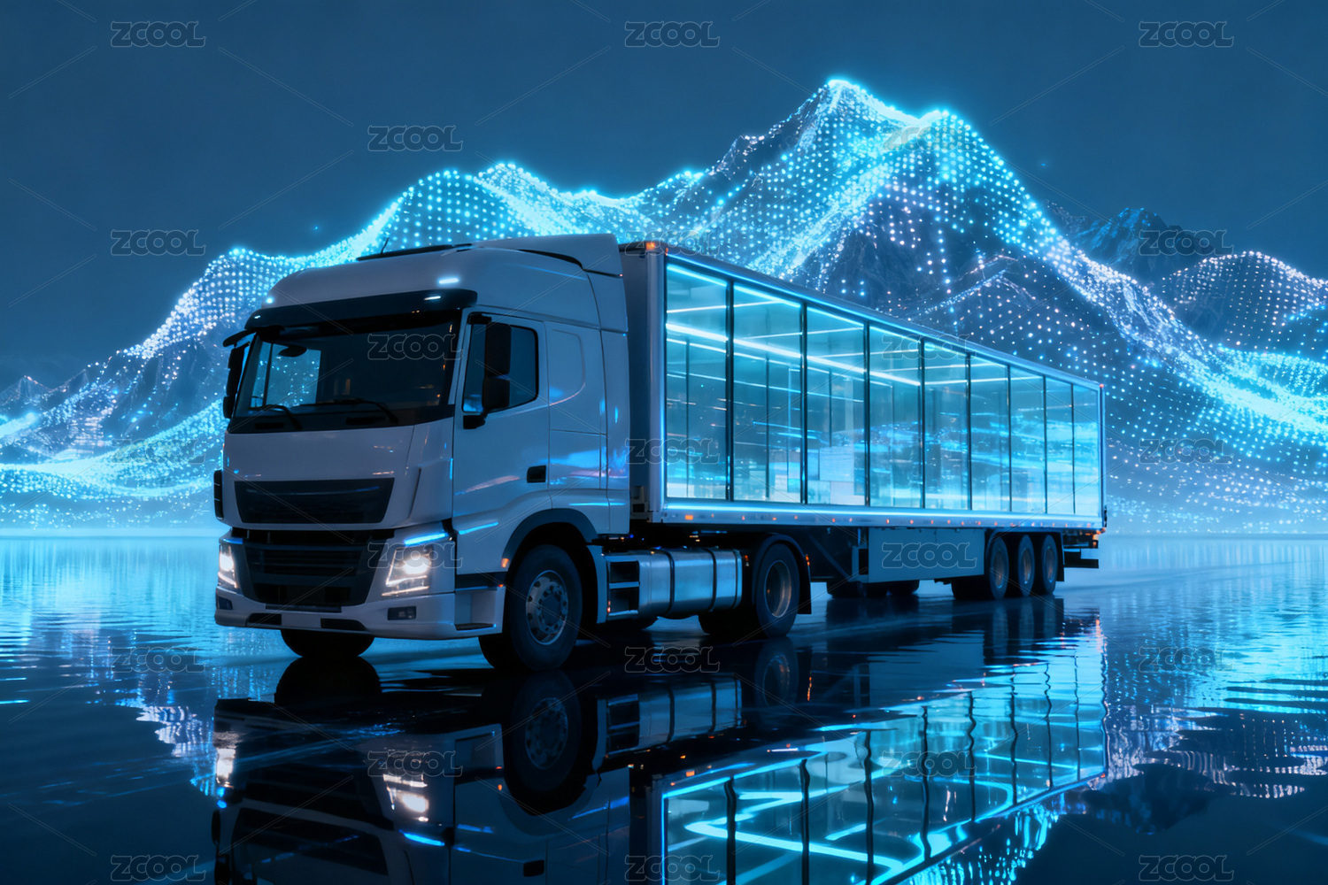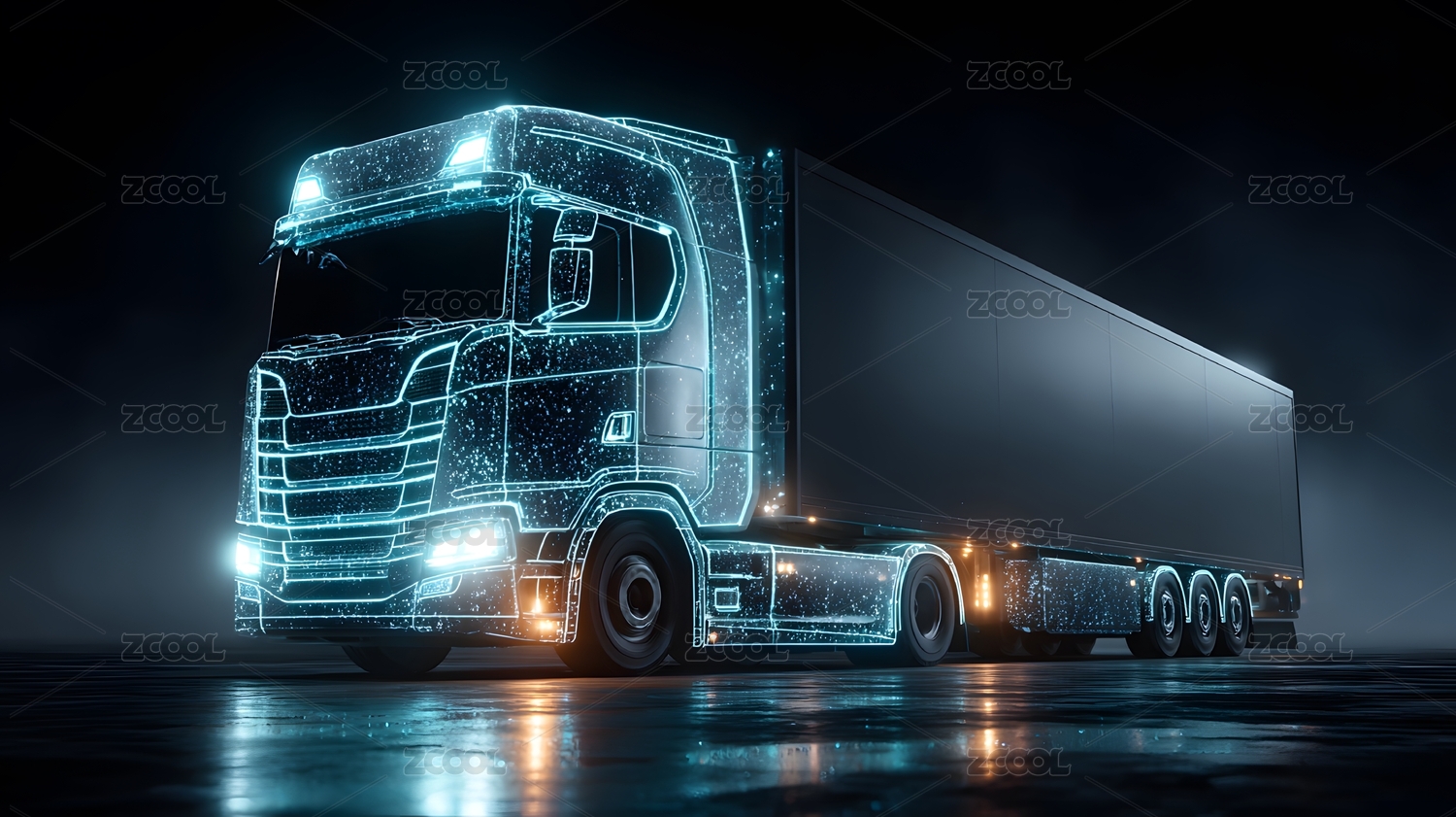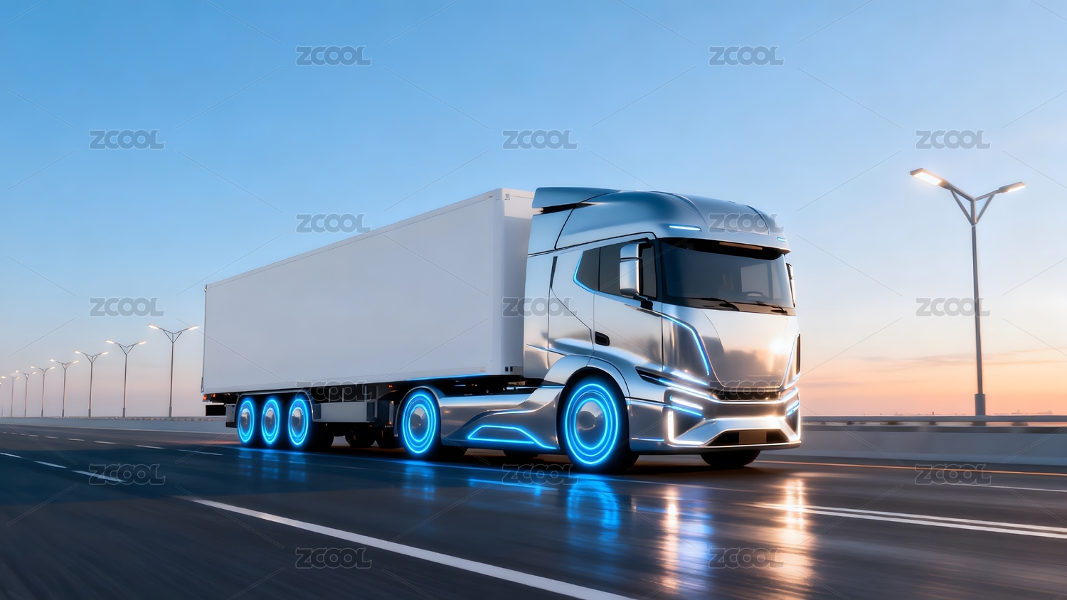 运输,卡车,货车,银色,现代,车身,车灯,路灯,夕阳,天空