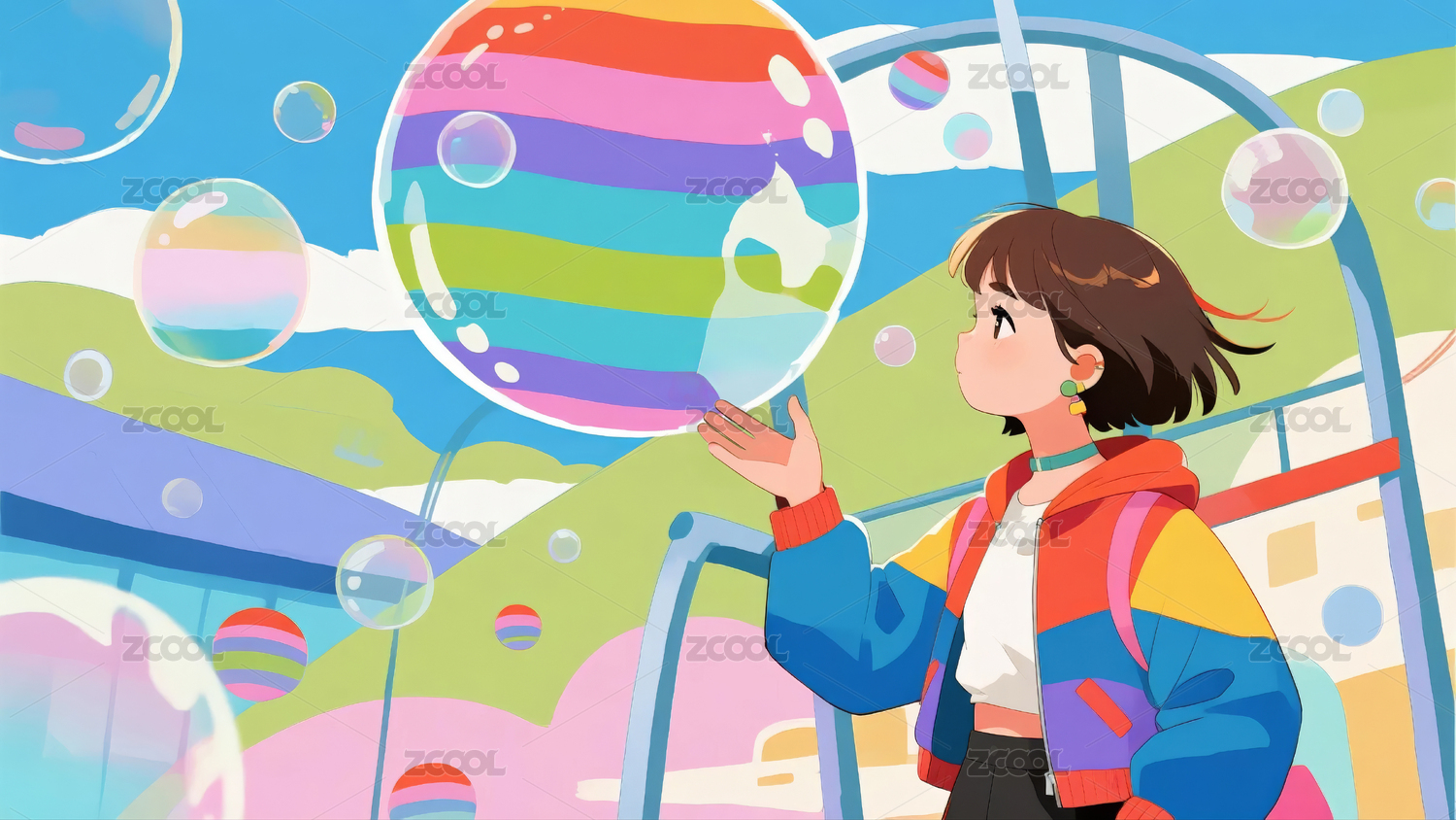 女孩凝视着彩色的大气泡