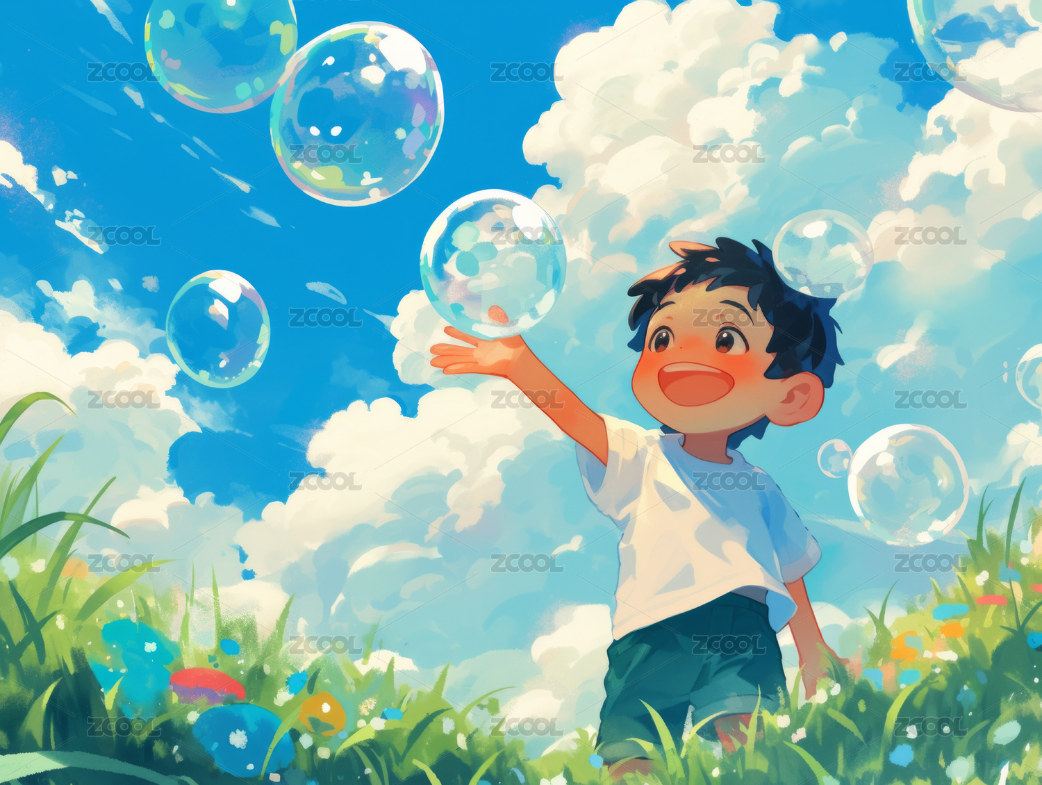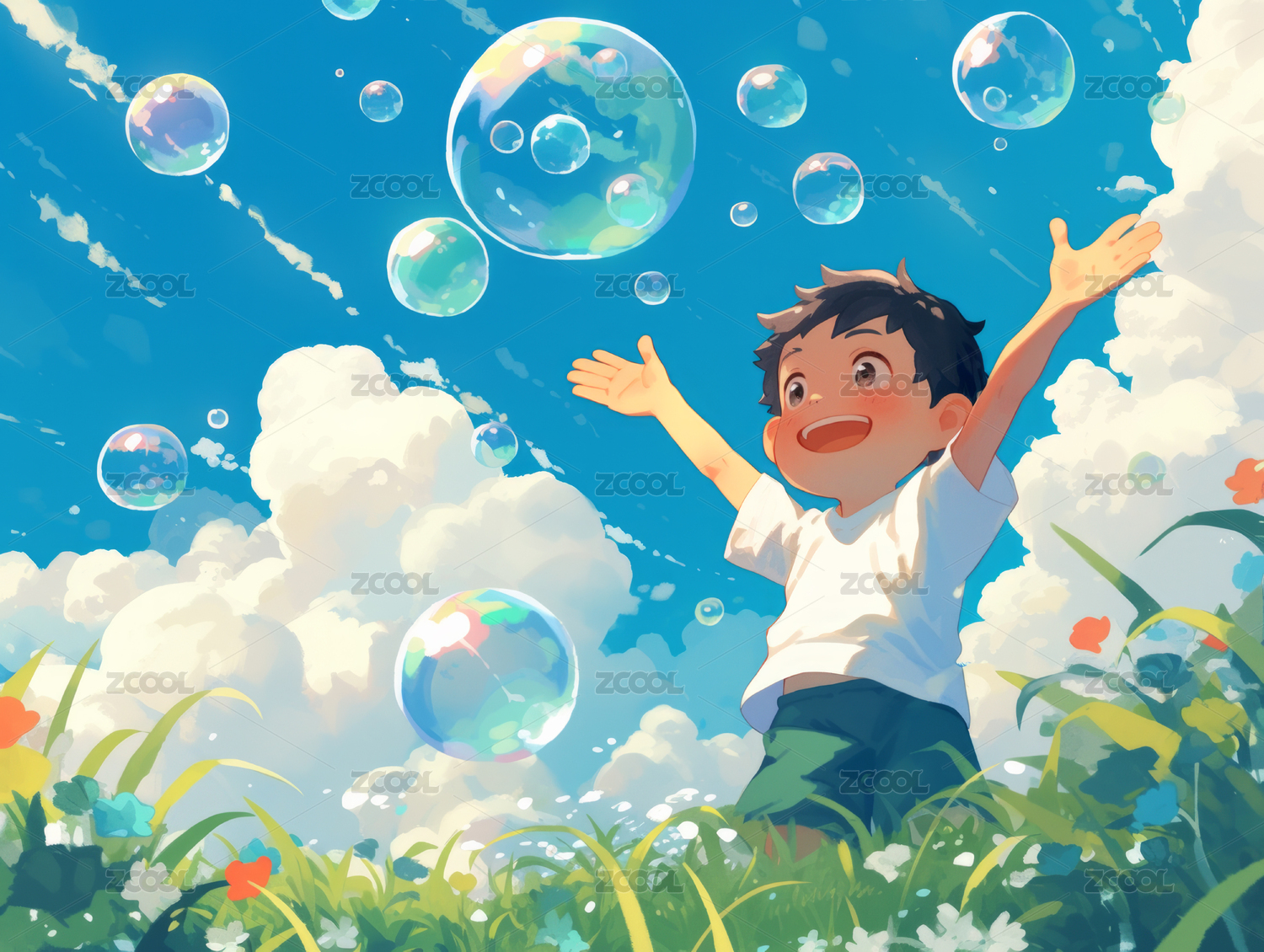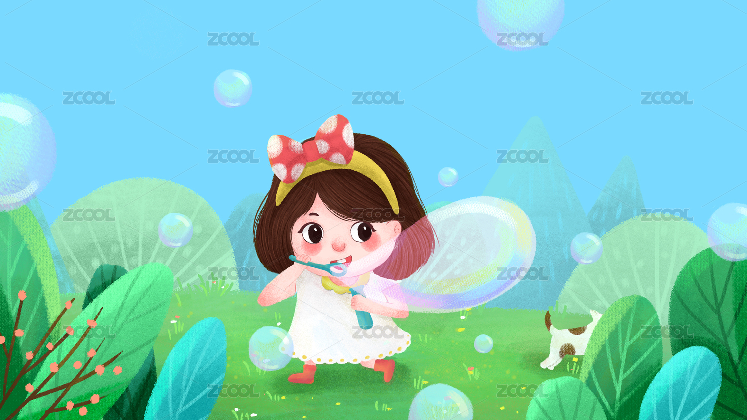 户外和泡泡开心玩耍的孩子插画