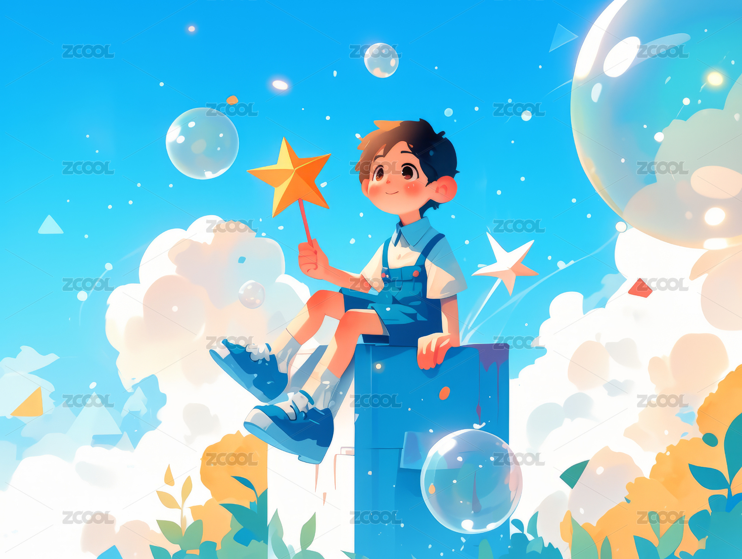 插画,二次元,卡通,治愈,天空,设计,蓝色,星星,梦幻,背景