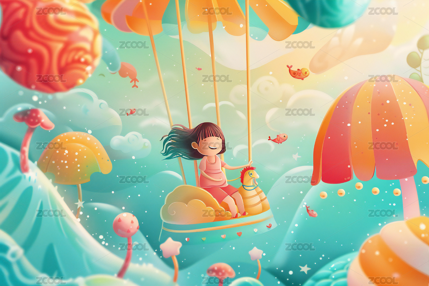 小孩玩耍开心治愈系风景创意奇幻插画