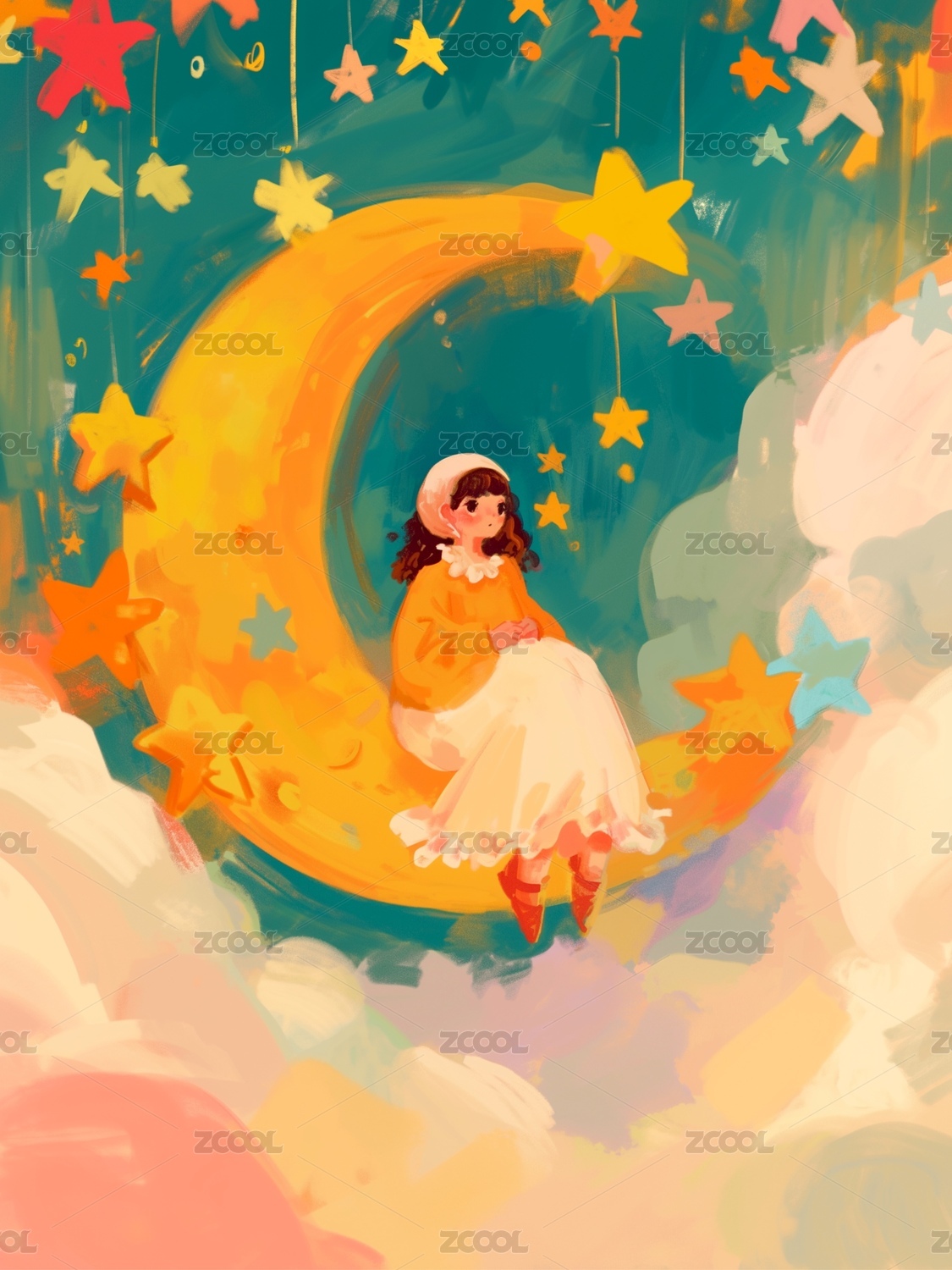 坐在月亮上的女孩插画