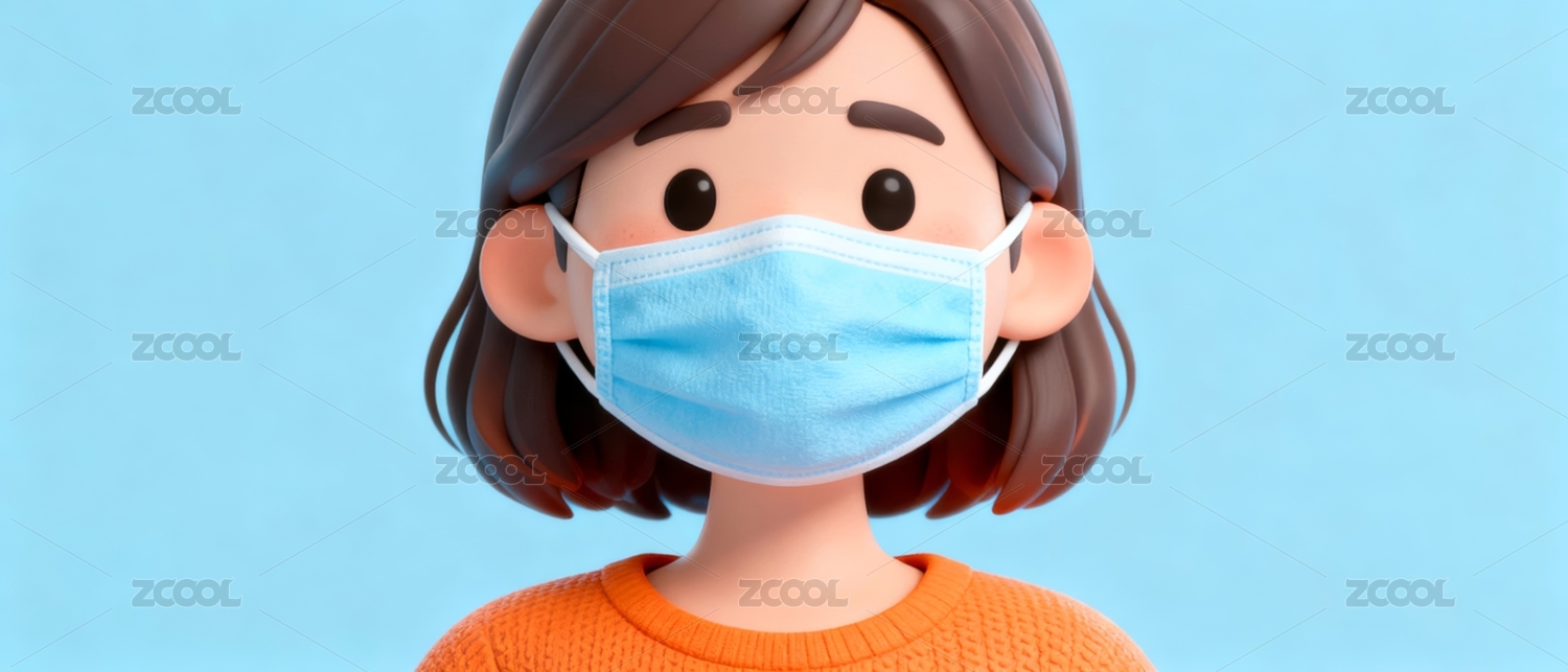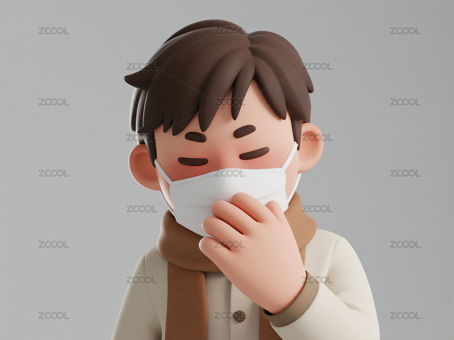夏天白天晴天戴口罩穿T恤男孩3D立体插画