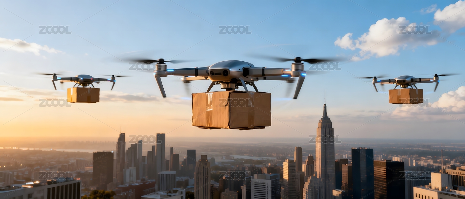 无人机城市配送夕阳景象