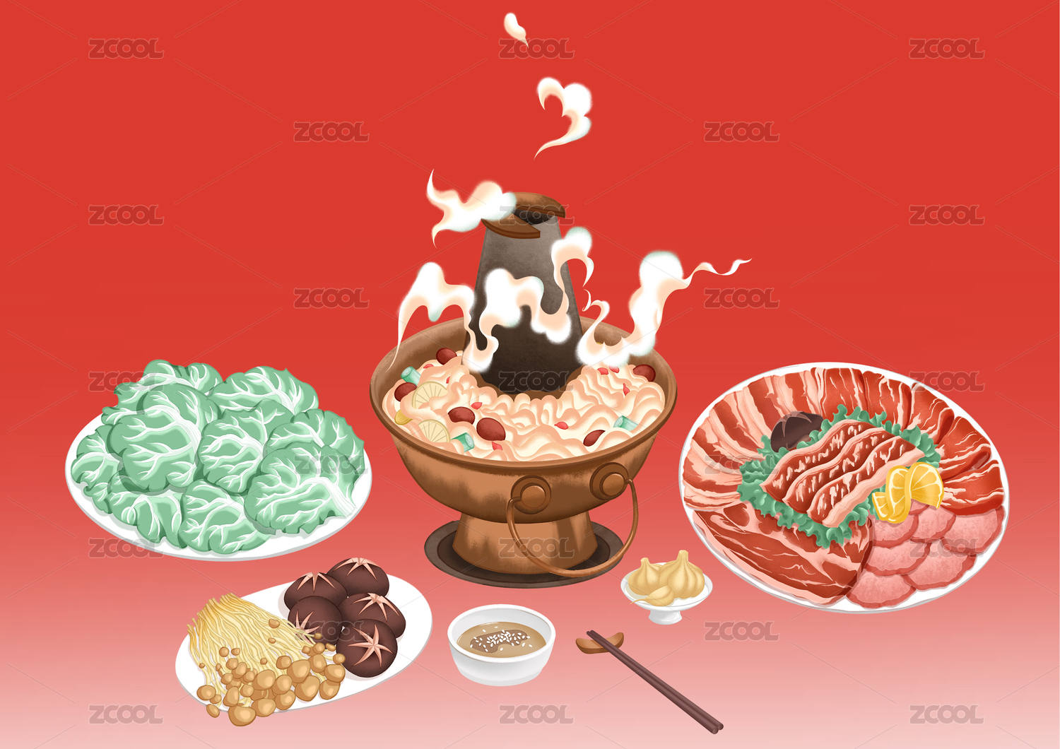中式传统美食铜锅涮肉涮羊肉火锅插画