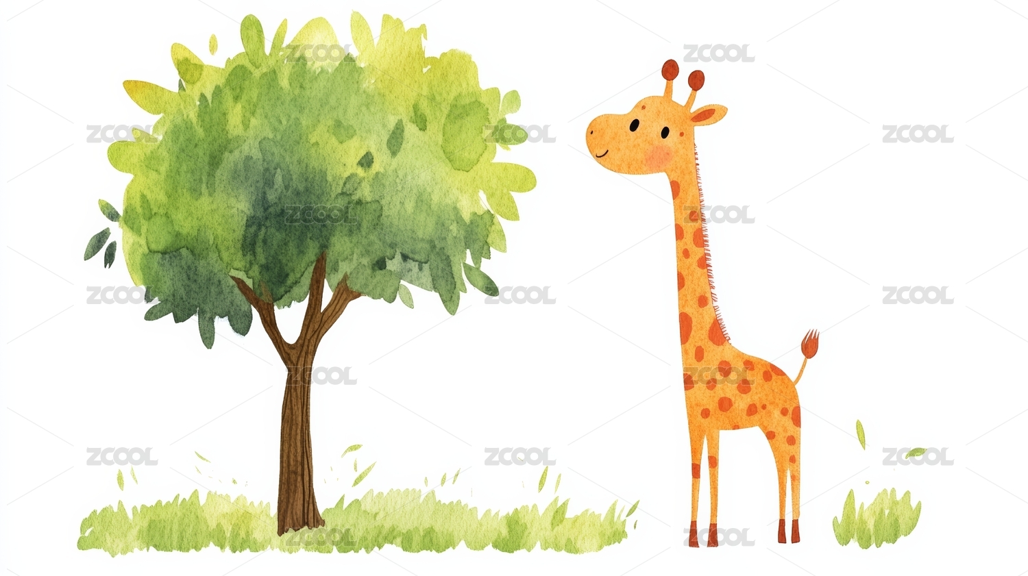 长颈鹿,卡通,大树,插画,可爱,绿色,草地,动物,黄色,儿童