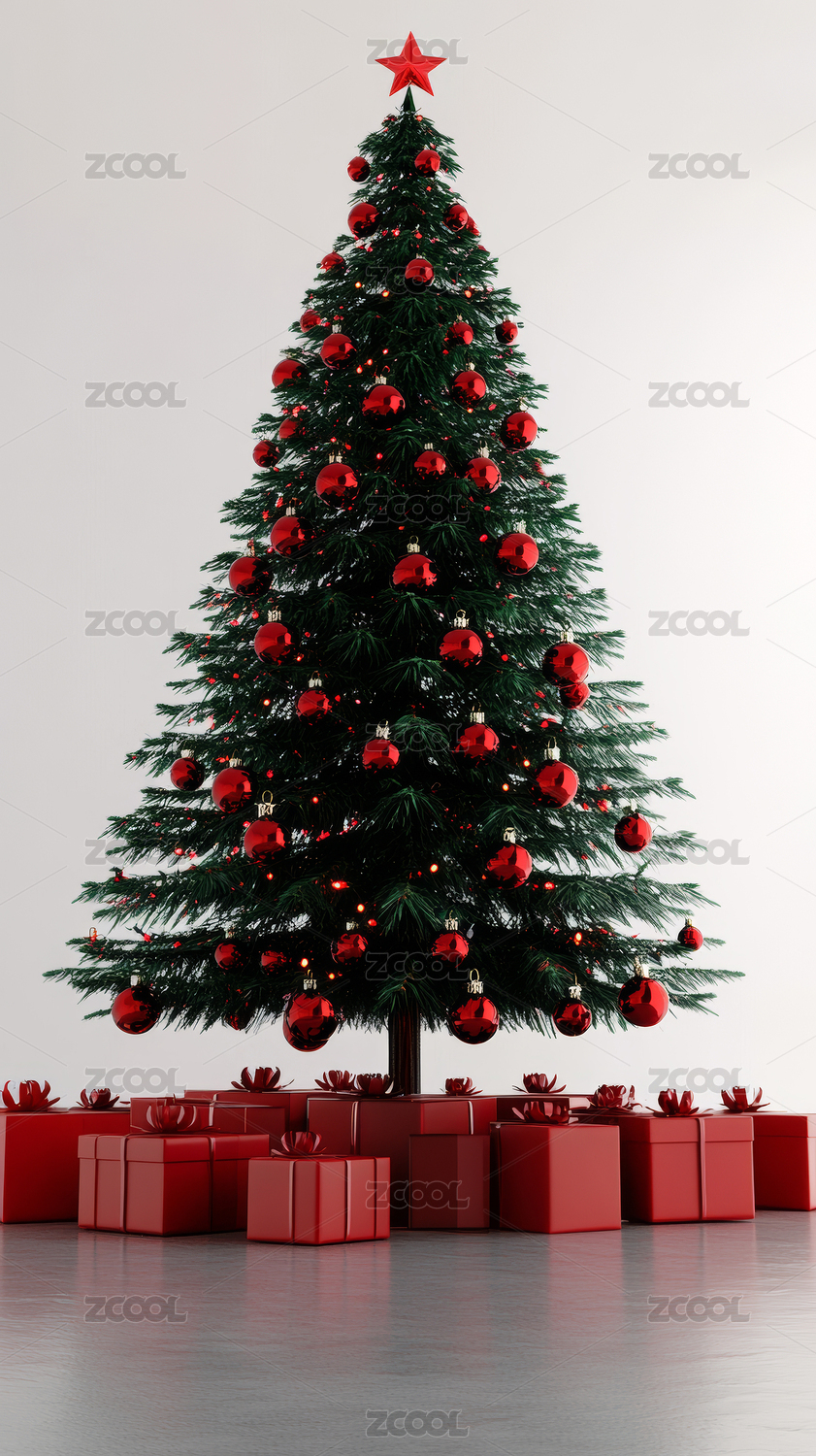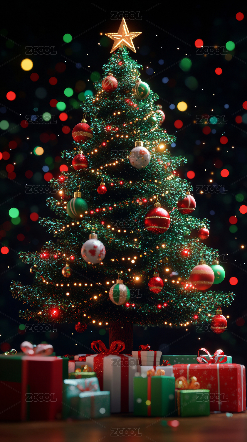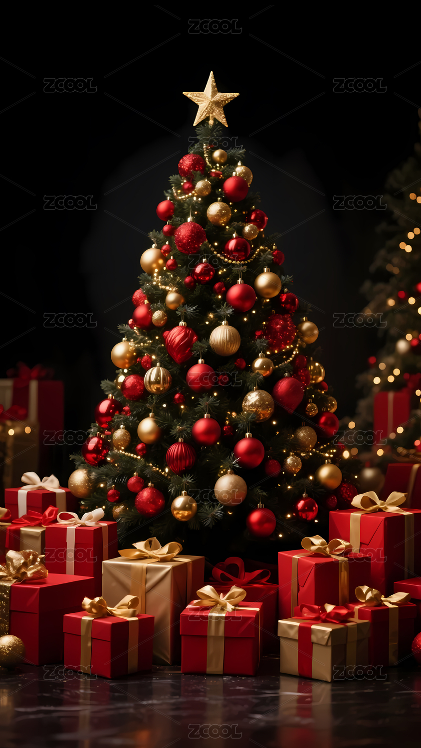 圣诞树,礼物盒,松针,丝带,金星,银球,黑球,绿叶,吊饰,蝴蝶结