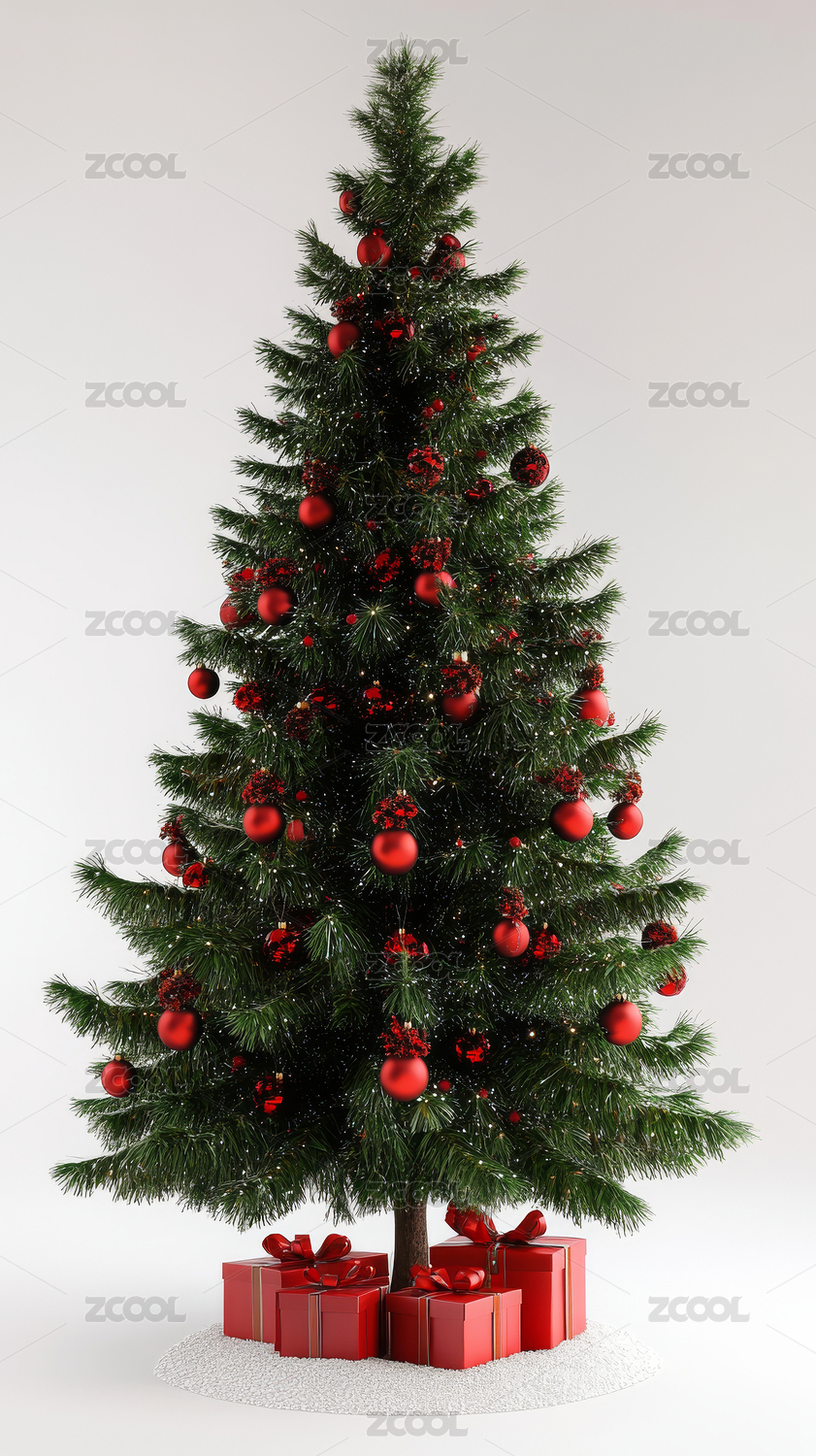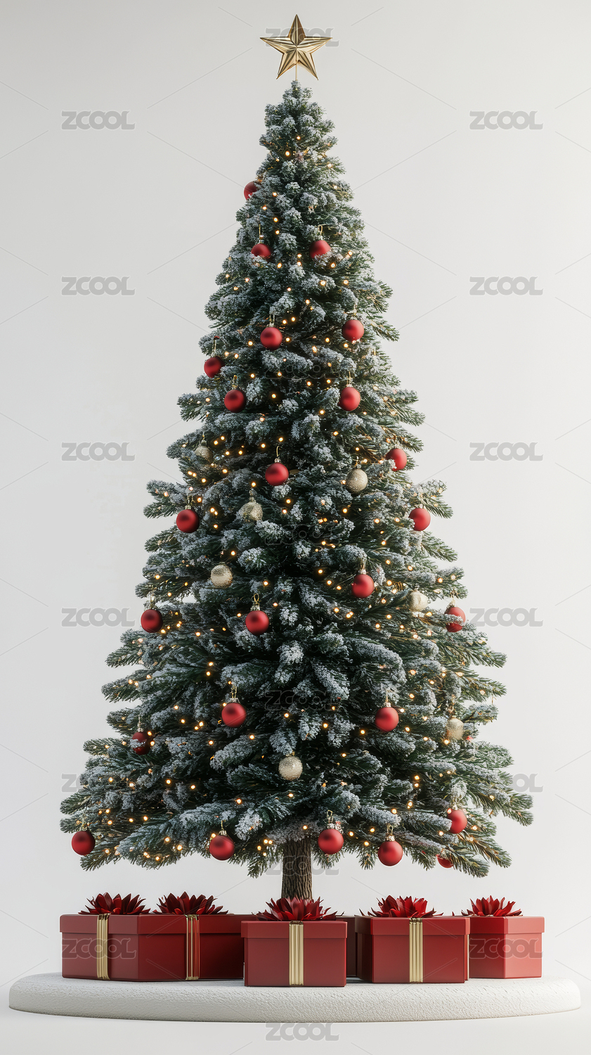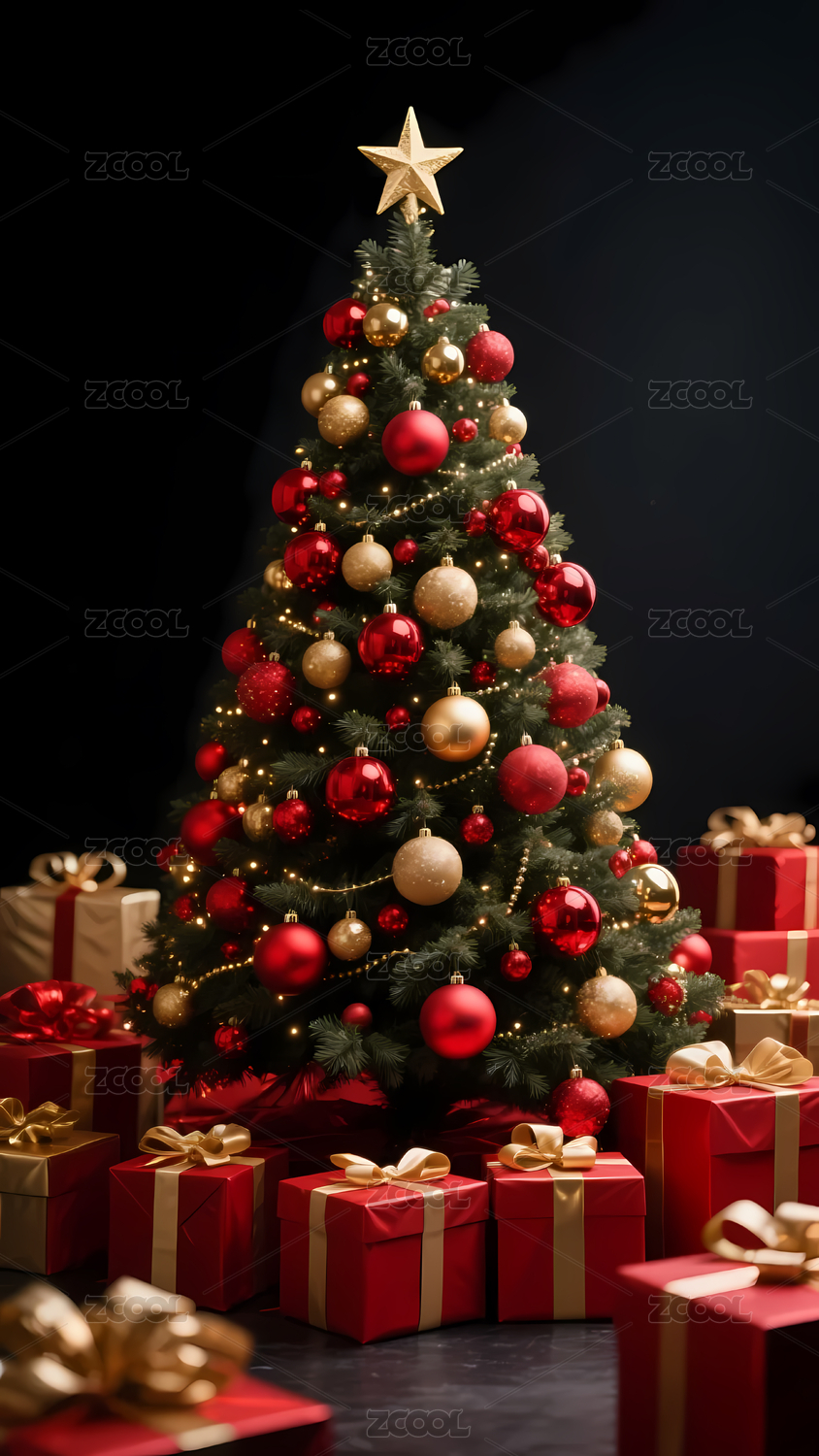 圣诞树,礼物盒,松针,丝带,金星,银球,黑球,绿叶,吊饰,蝴蝶结