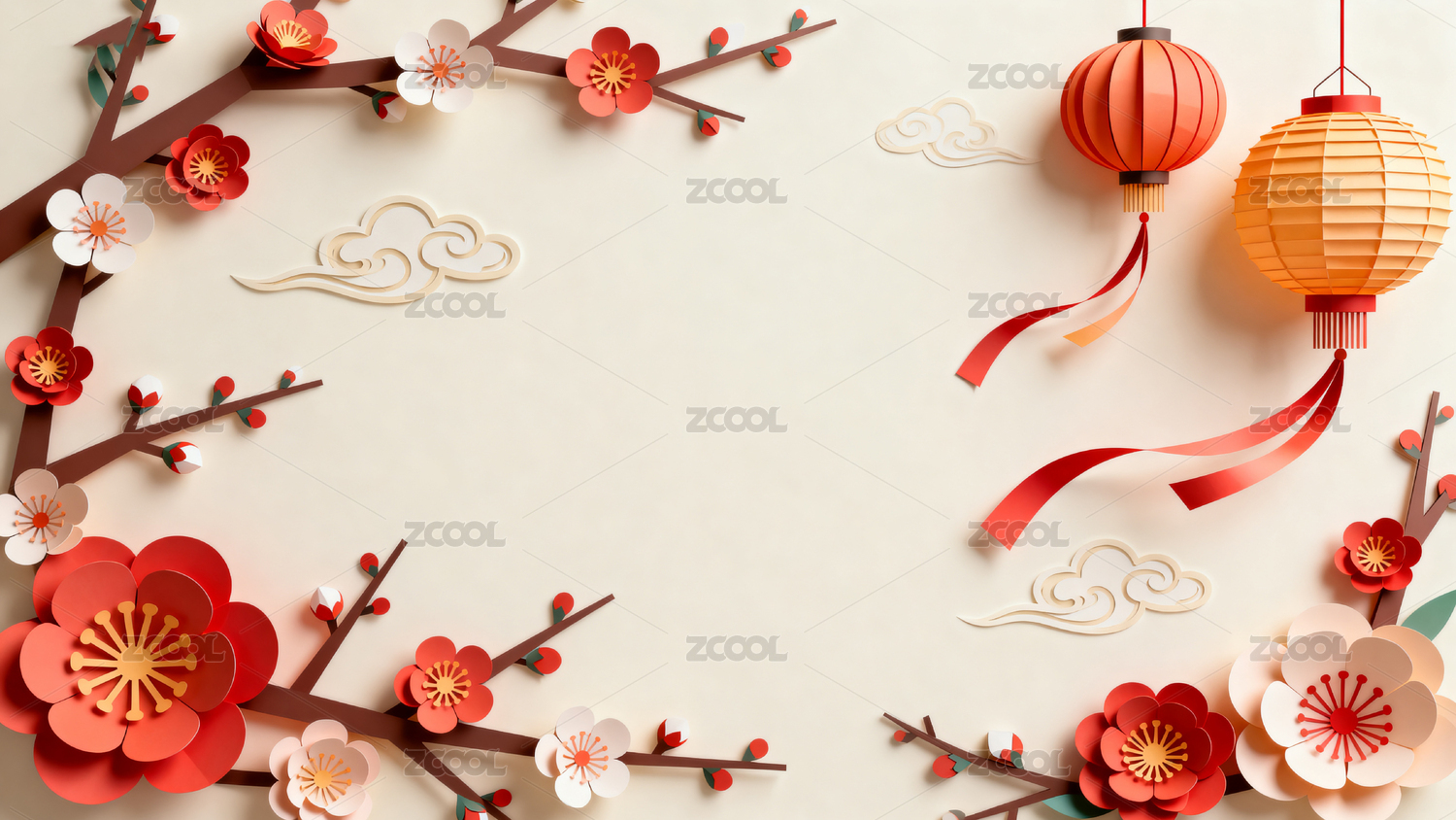 节日剪纸风灯笼和花卉装饰背景图