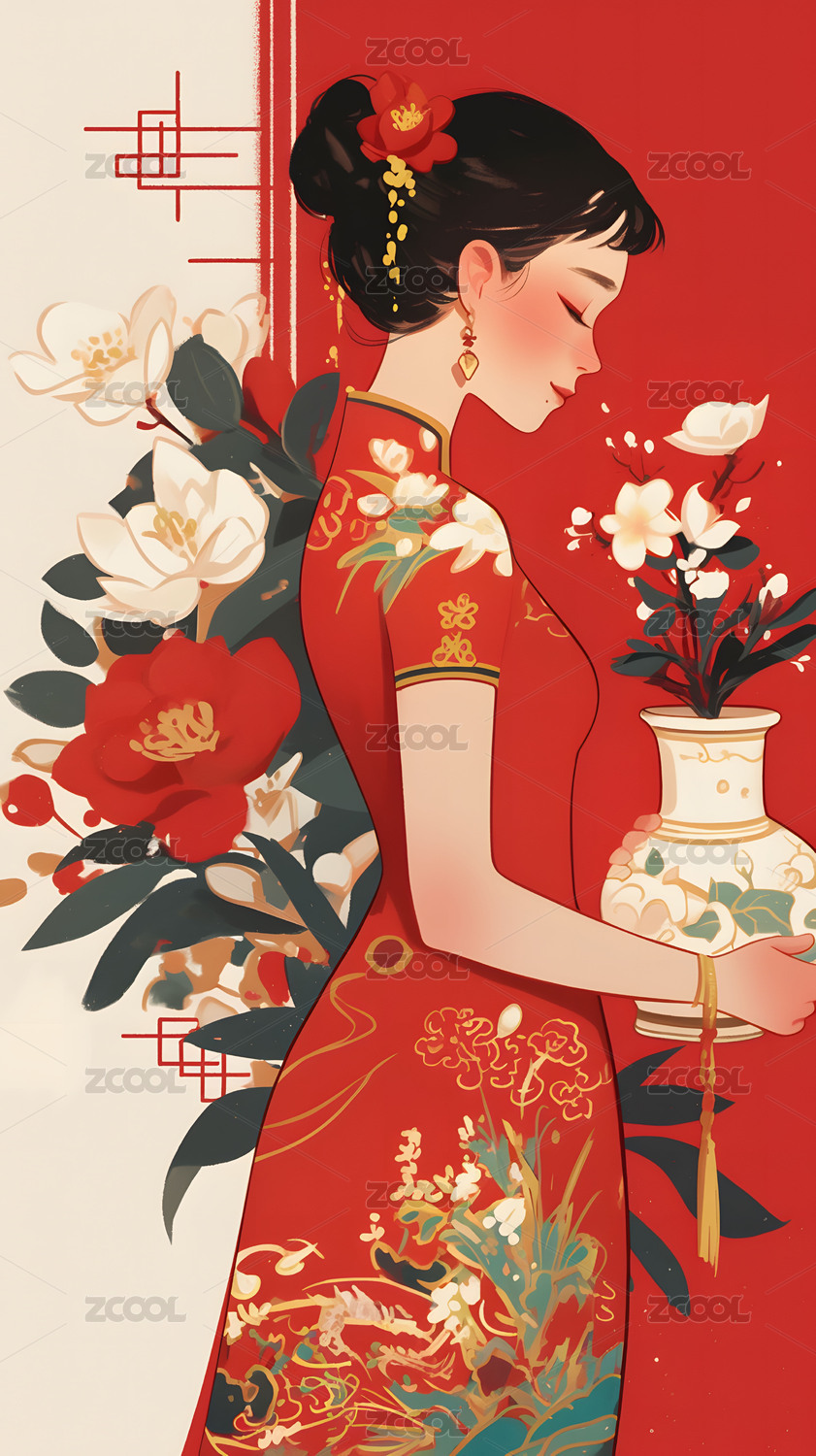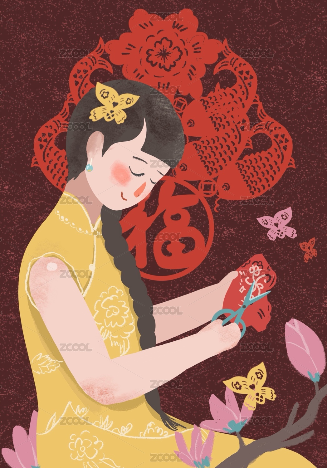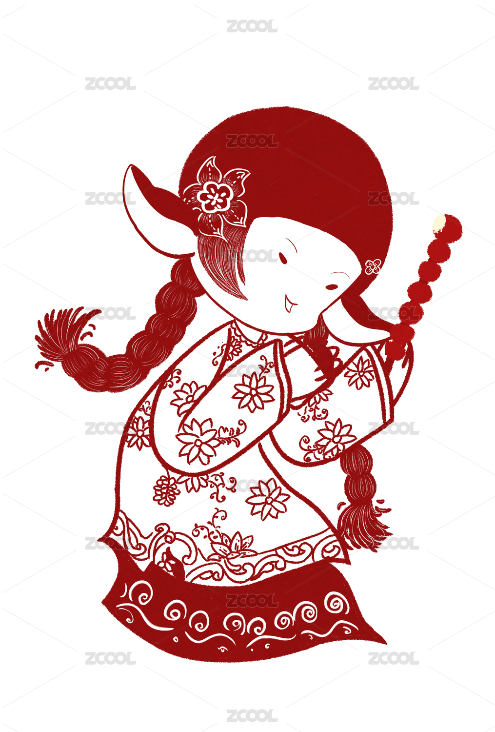 卡爱的人物剪纸窗花圆形中国风春节印刷打印