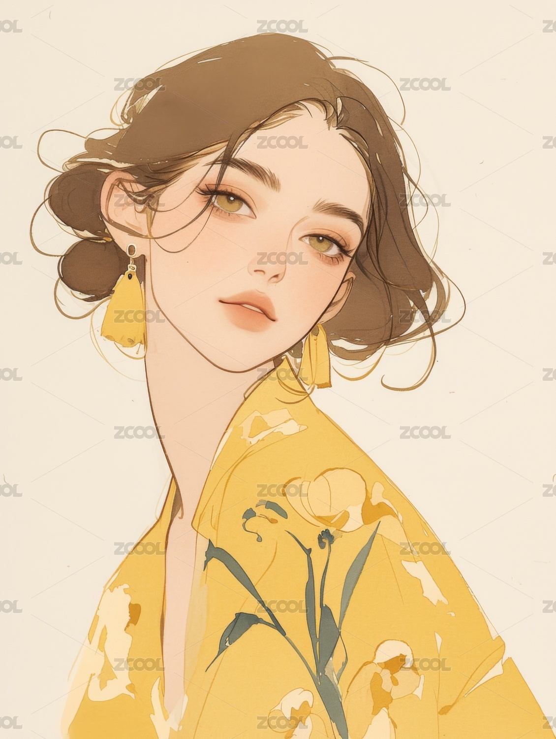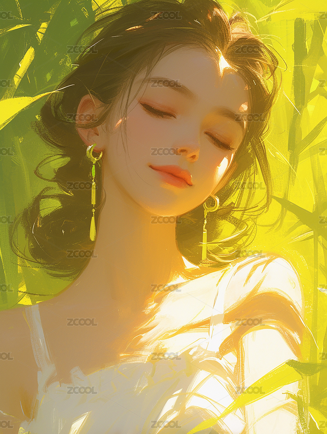 清新少女头像,配戴花朵耳环,绿意盎然
