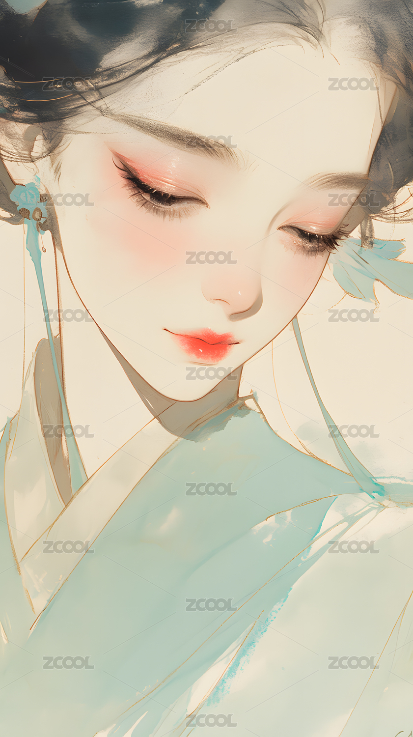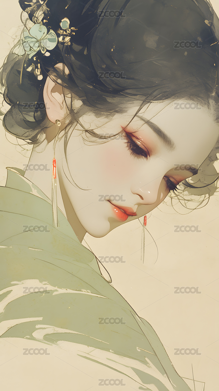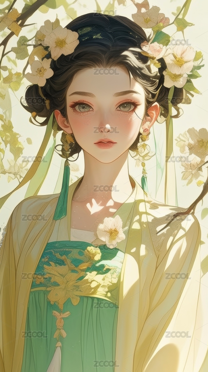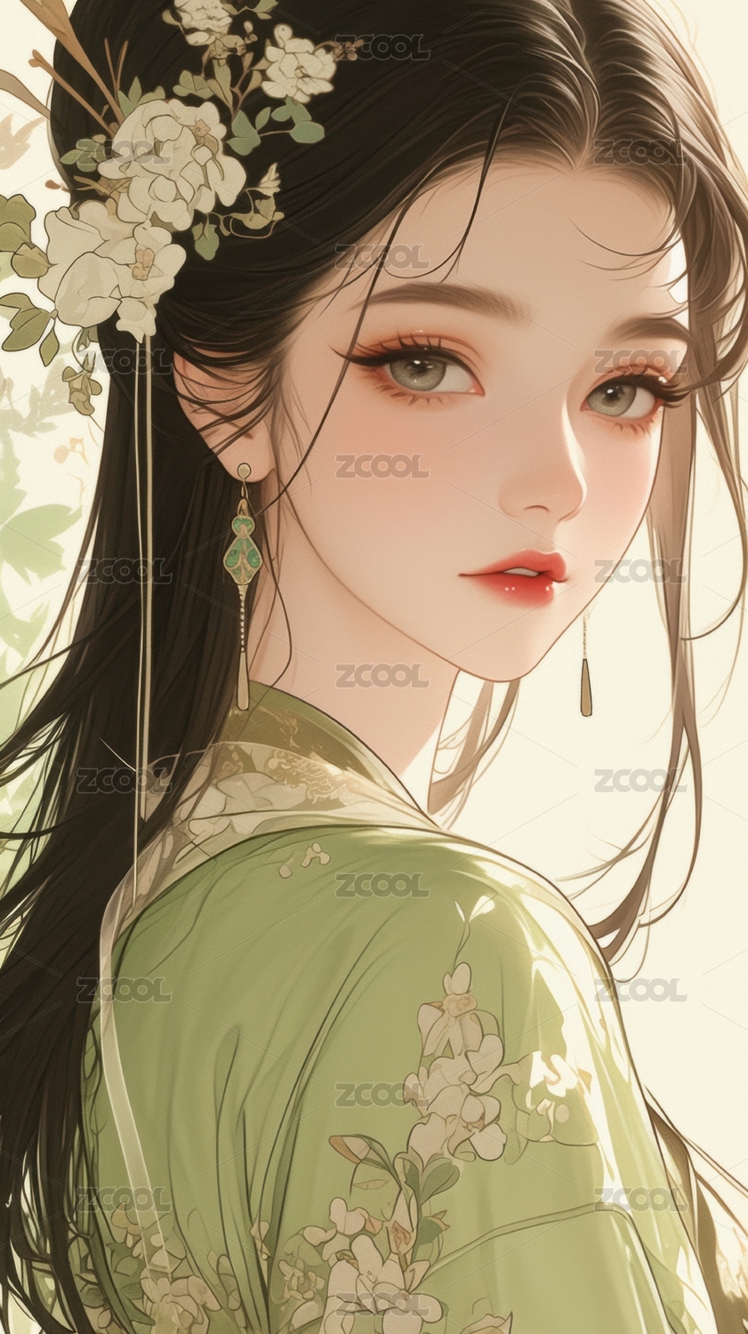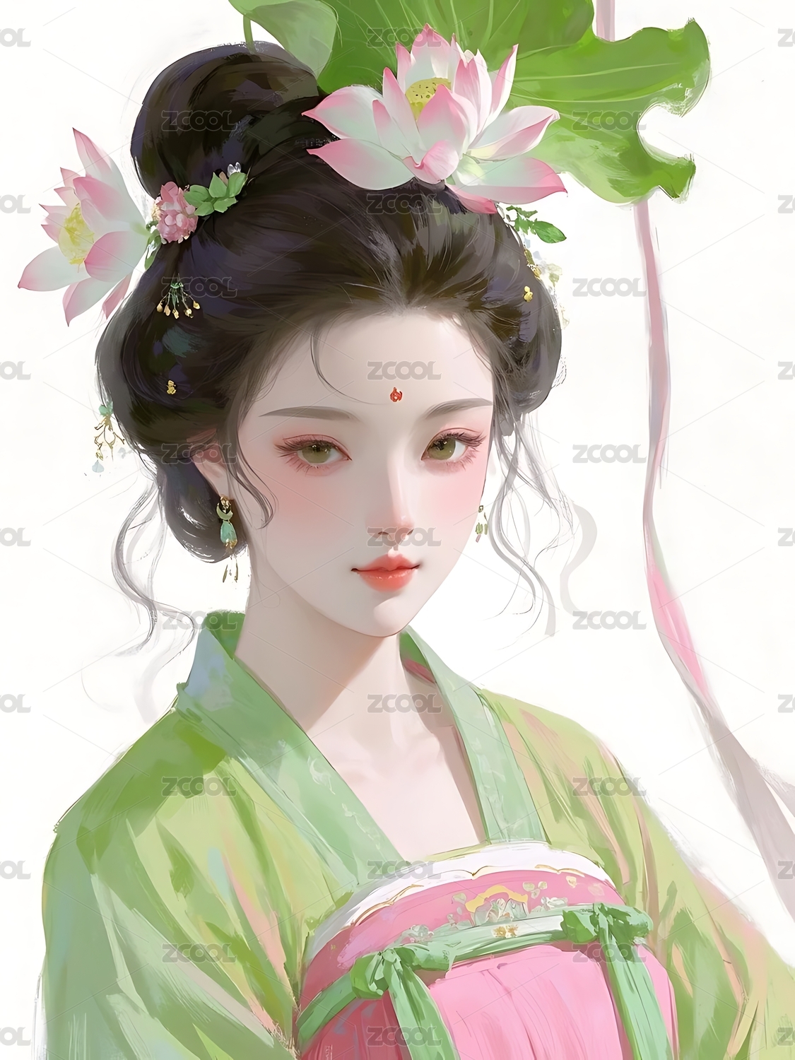 古典美人绿衣粉裙头戴荷花发饰优雅大方