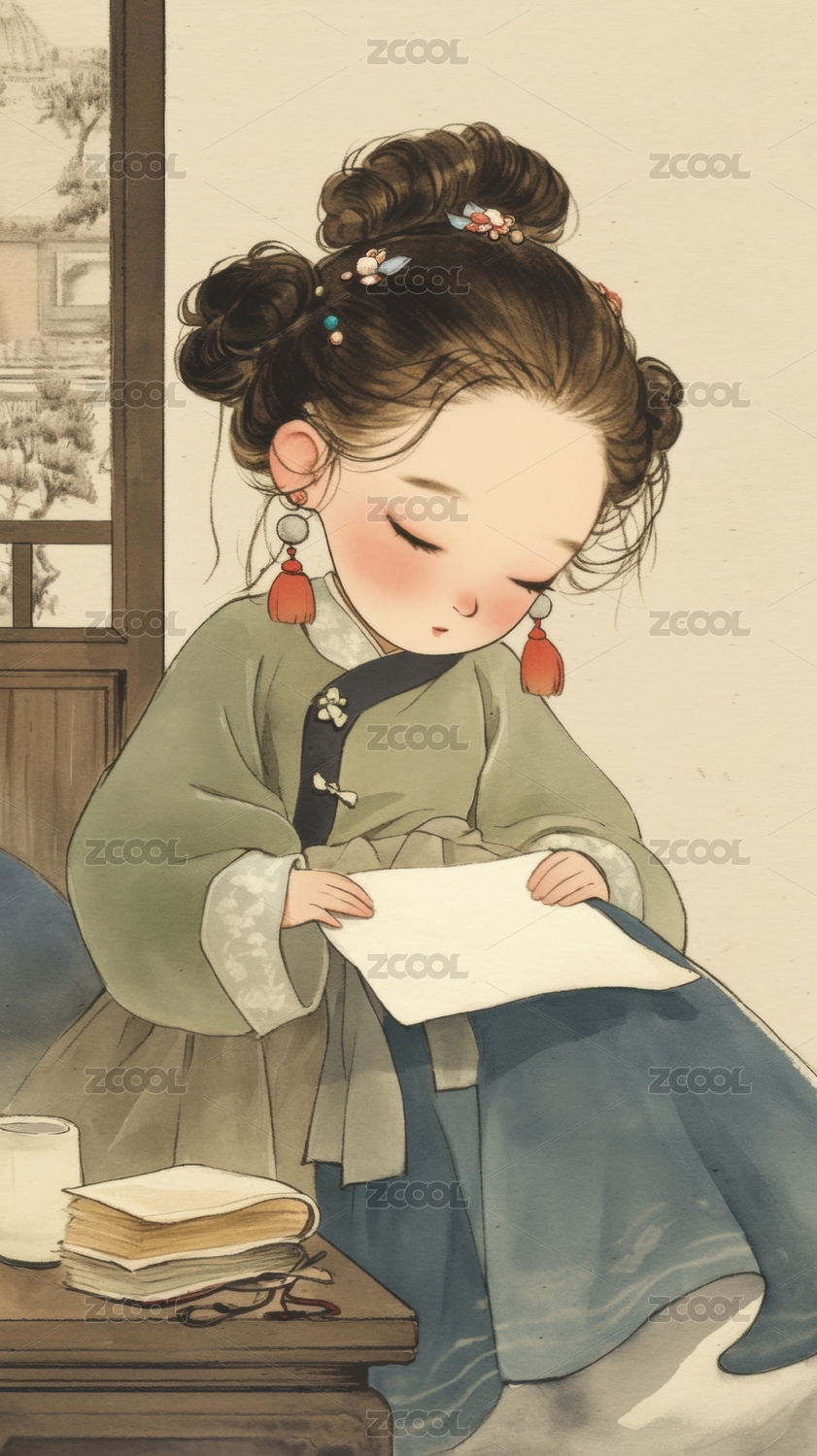 中国风树下乘凉吃西瓜的女孩和小猫插画