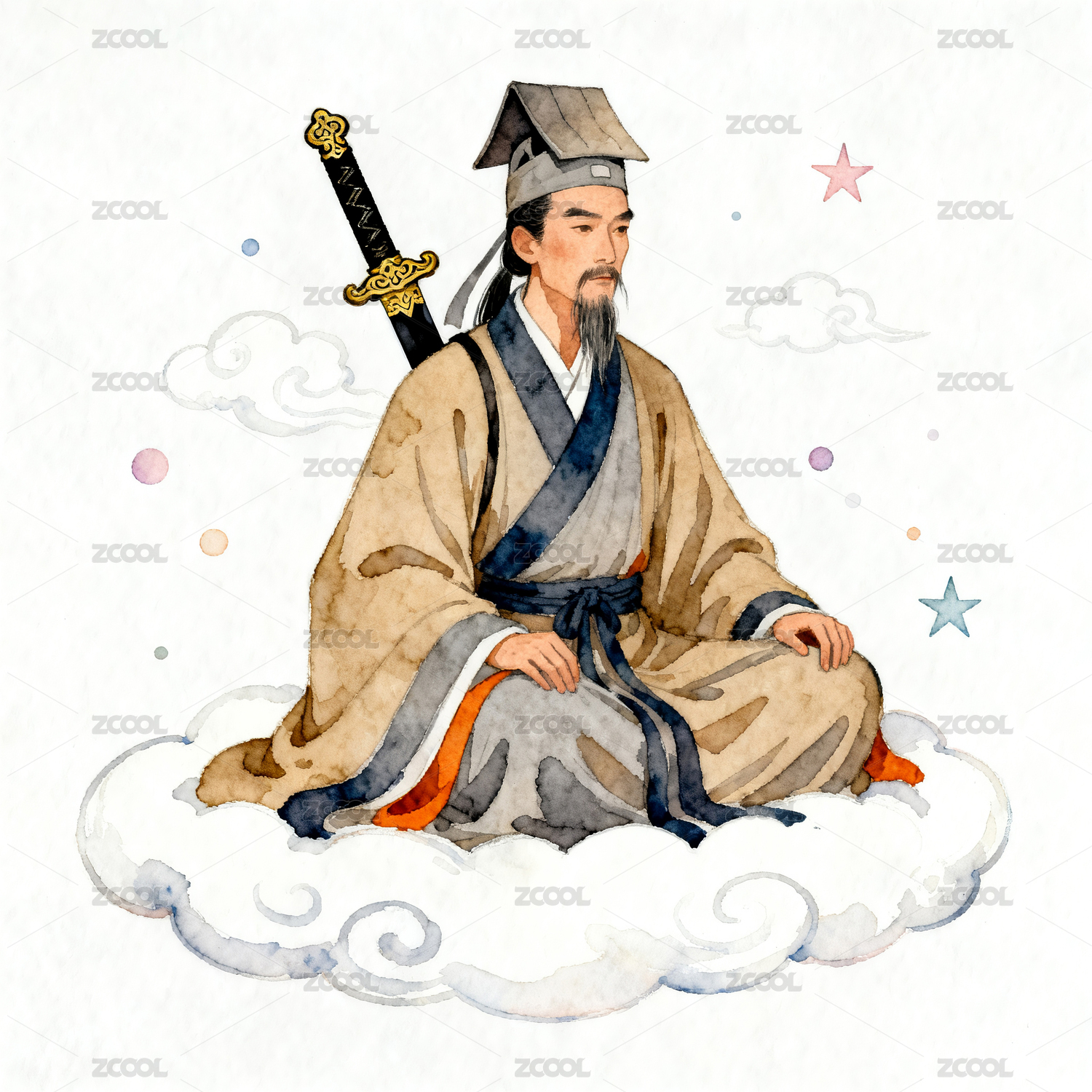 持剑古代人物站在云上