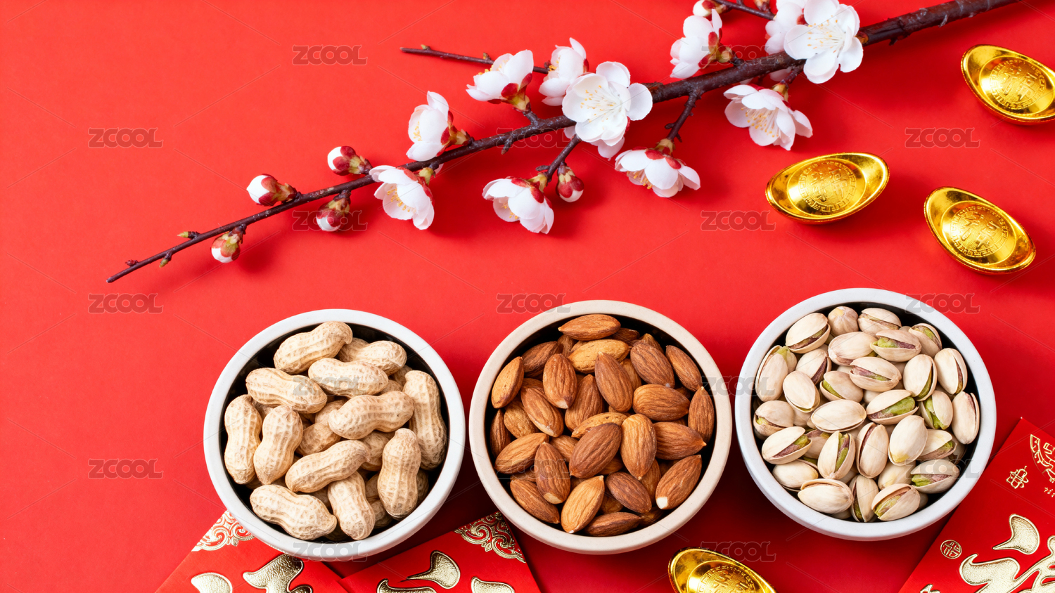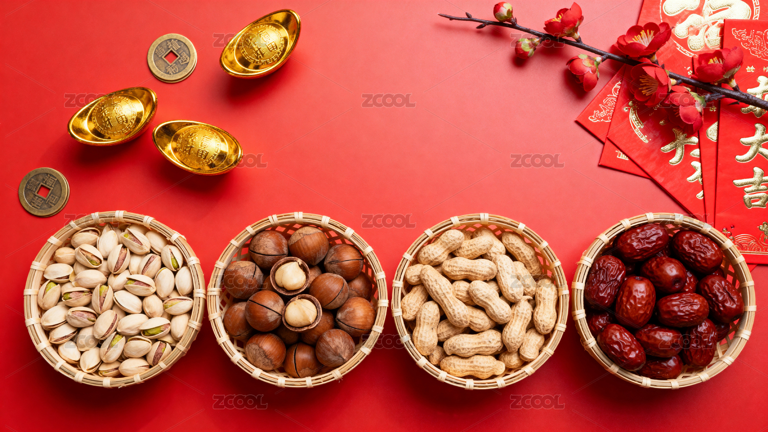 红色背景坚果与梅花装饰