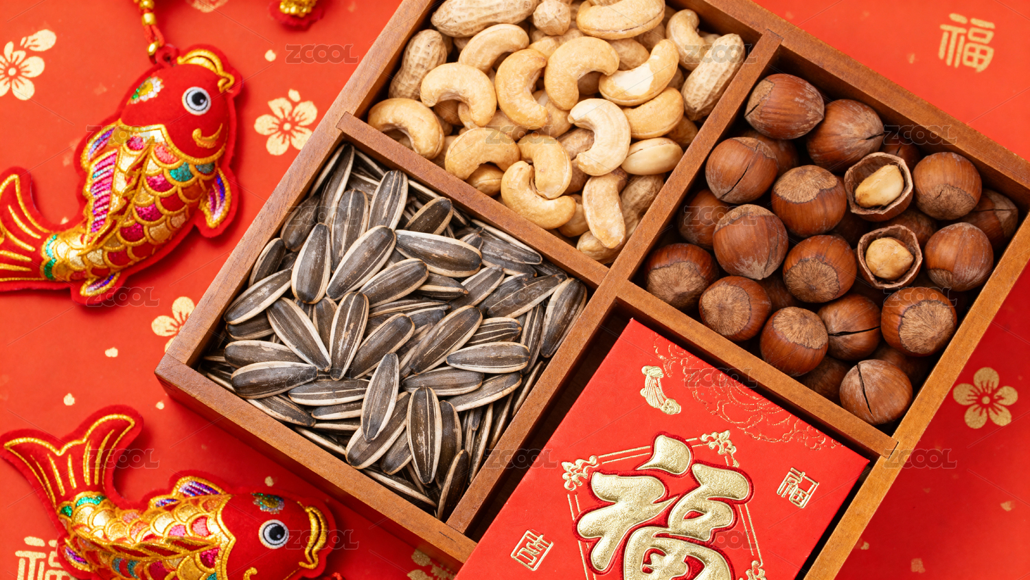 红色背景坚果与福字装饰