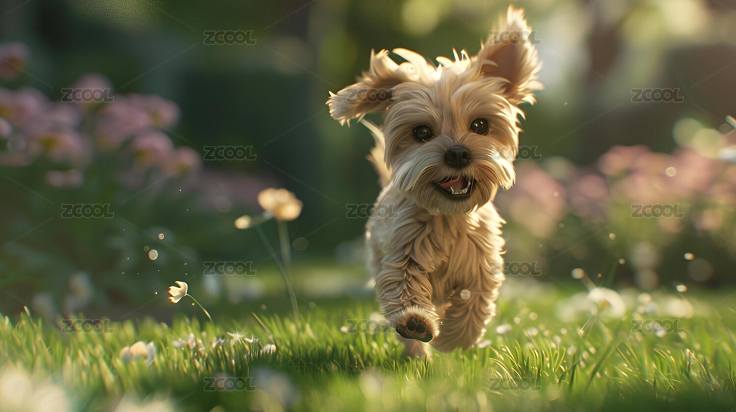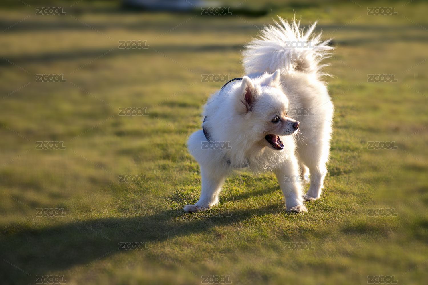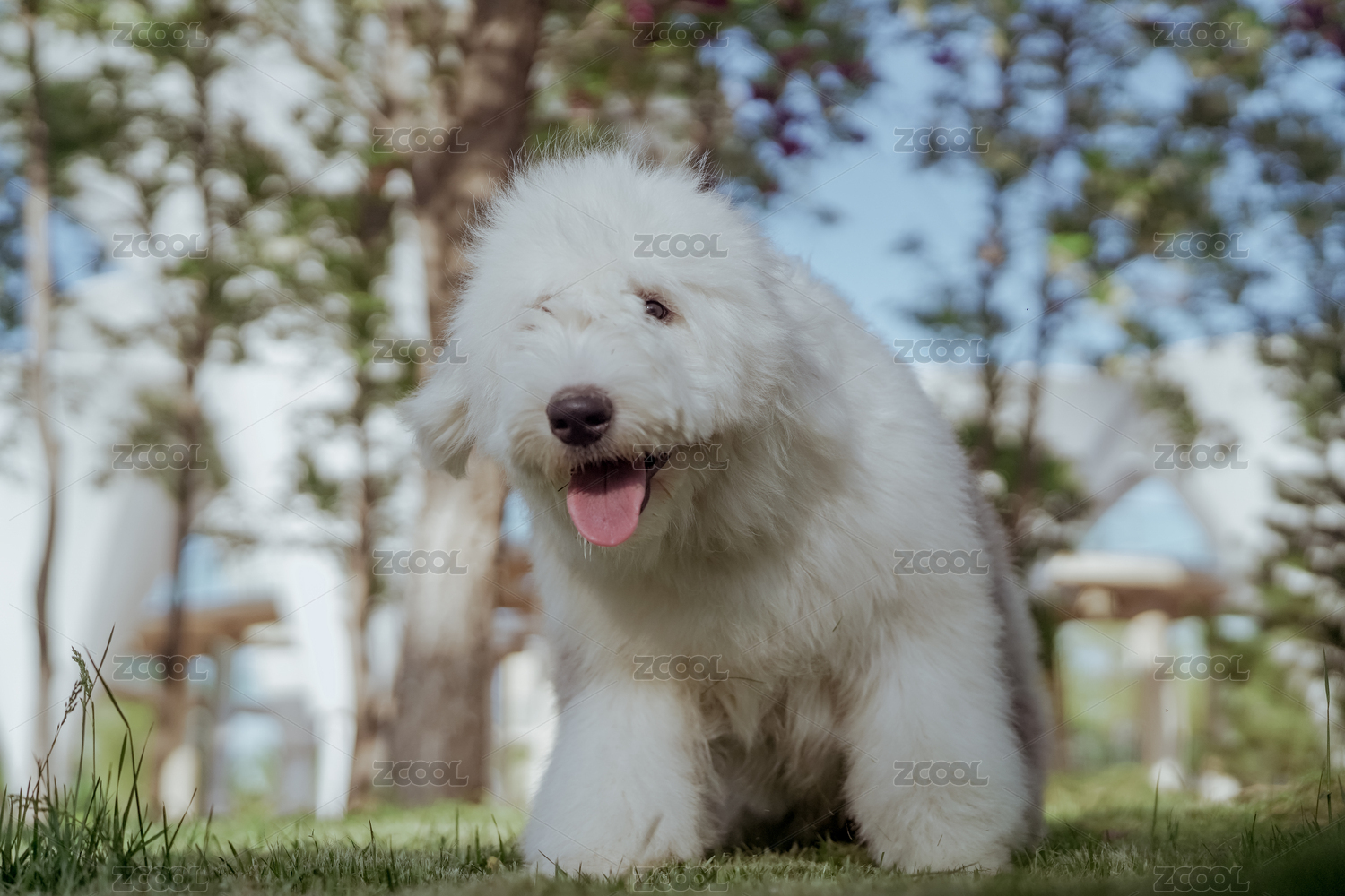 趴在公园在绿色草地上吐舌头的大白熊狗