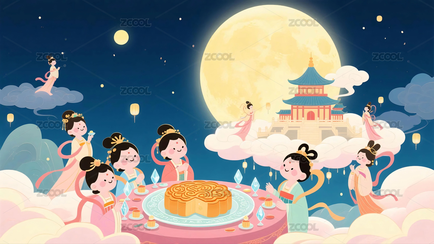 中秋节海报插画天宫的仙女们在聚会赏月