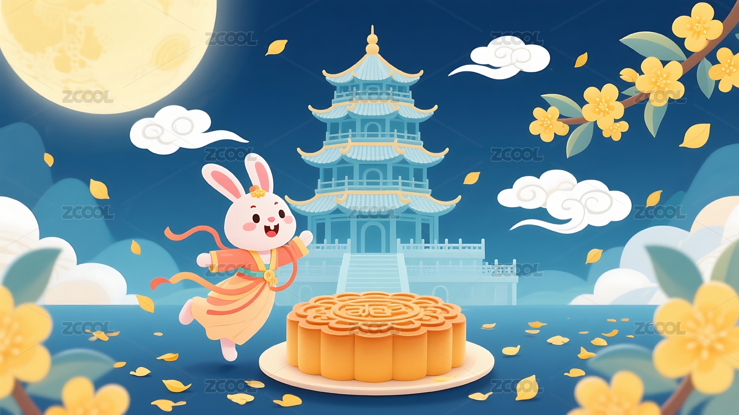 兔子,月亮,星星,玉兔,夜空,建筑,圆月,云朵,月饼,桂花