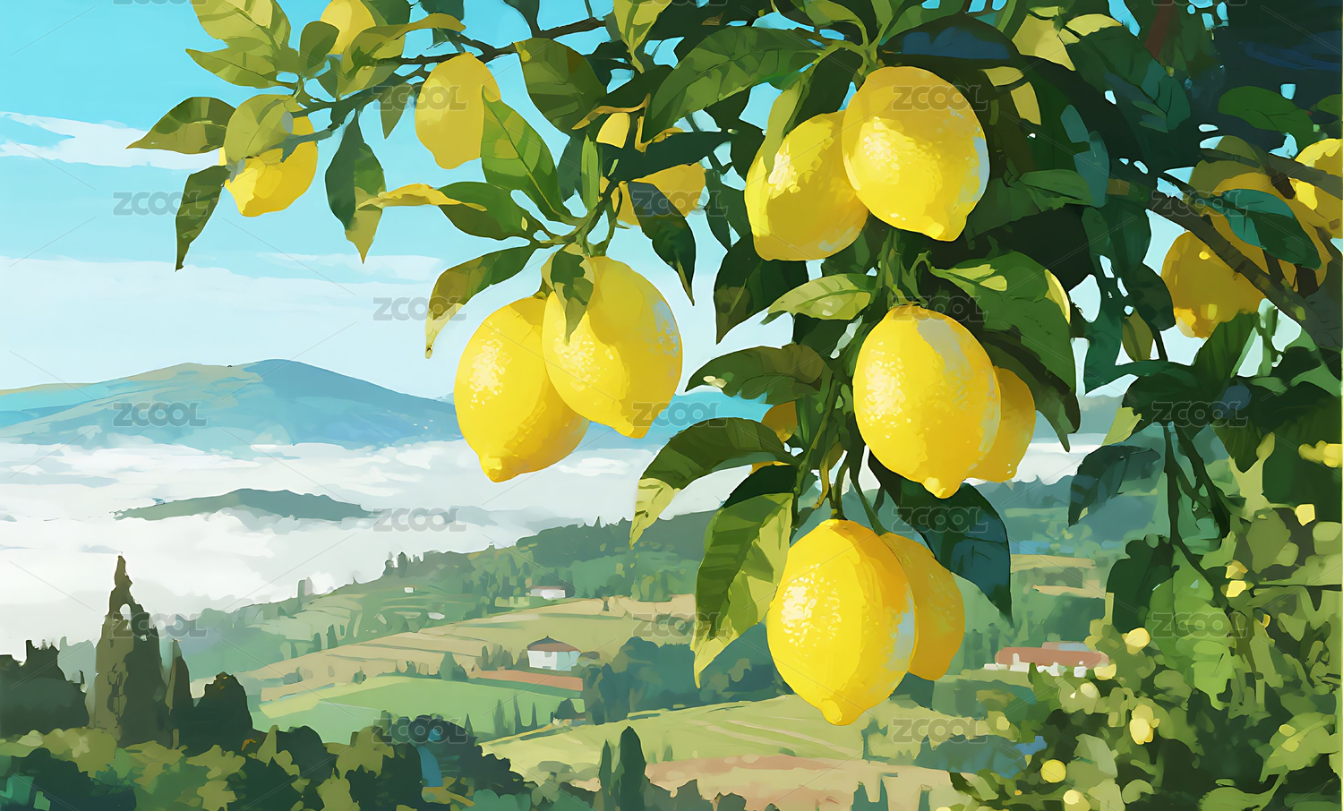 蓝天,天空,阳光,树木,果实,枝条,山脉,绿色,风景,自然