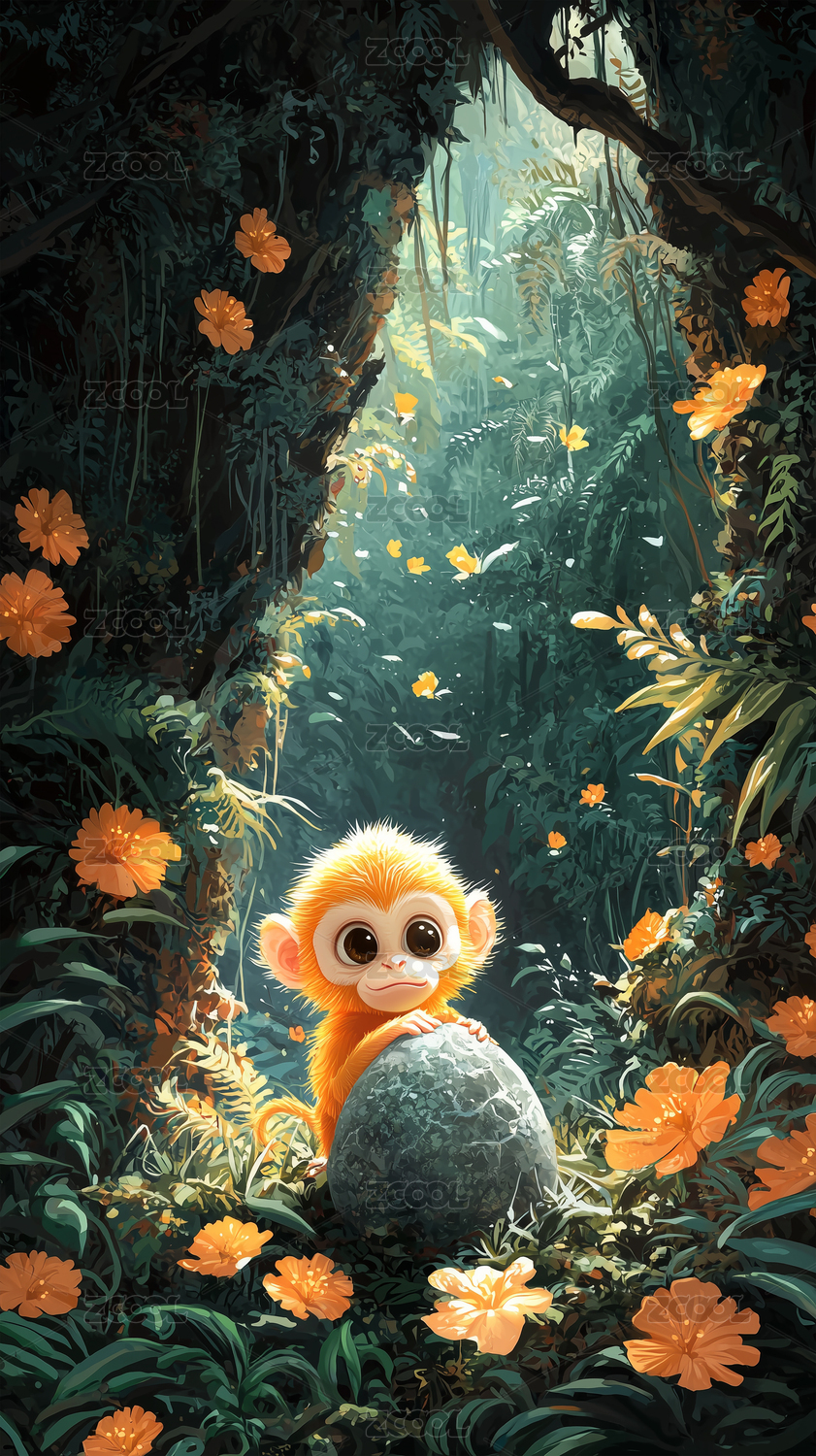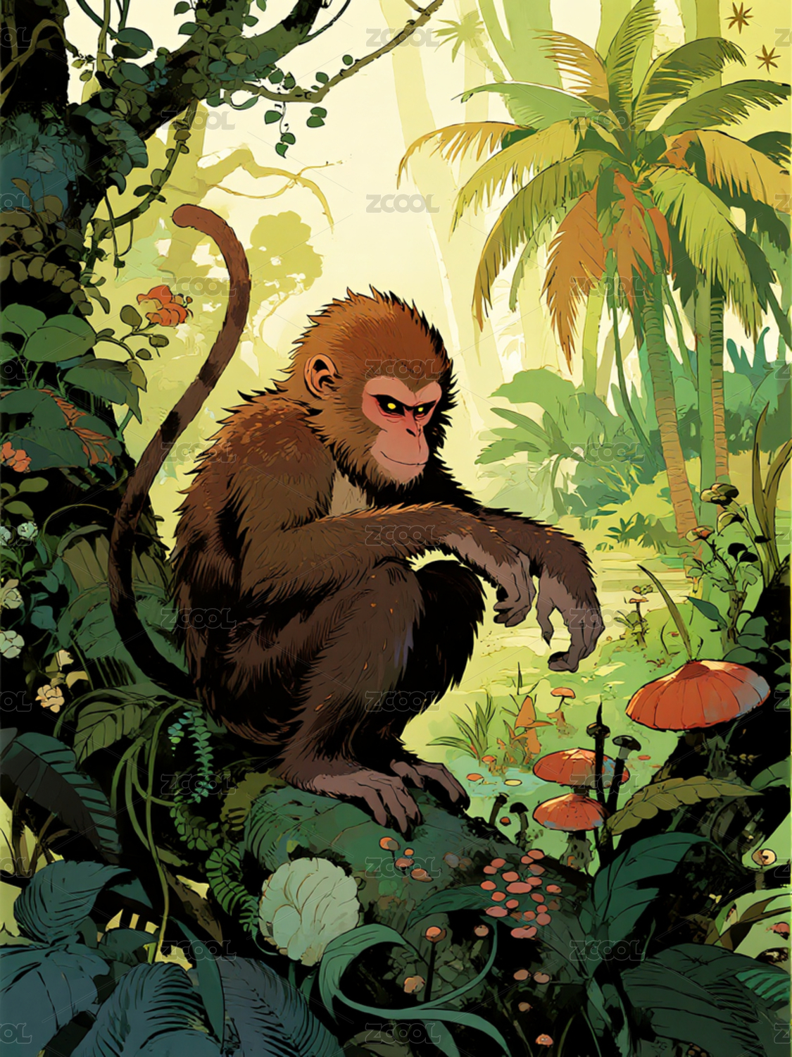 卡通猴子漫步热带雨林