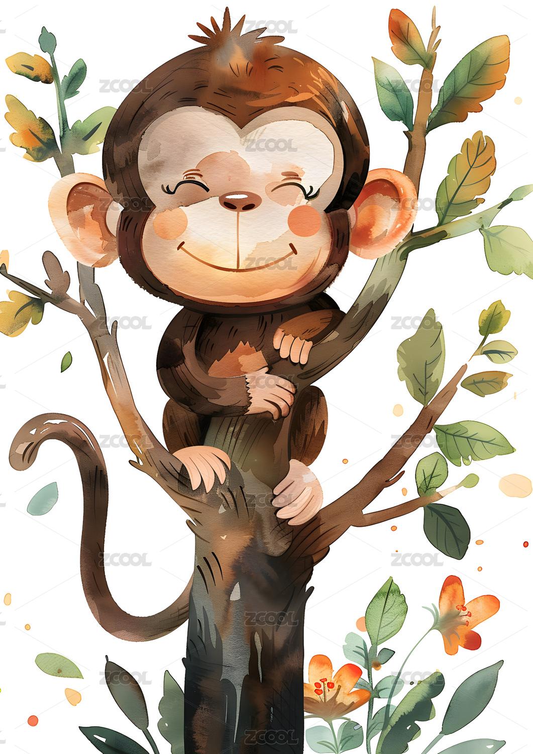 卡通可爱猴子在树上森林治愈系插画