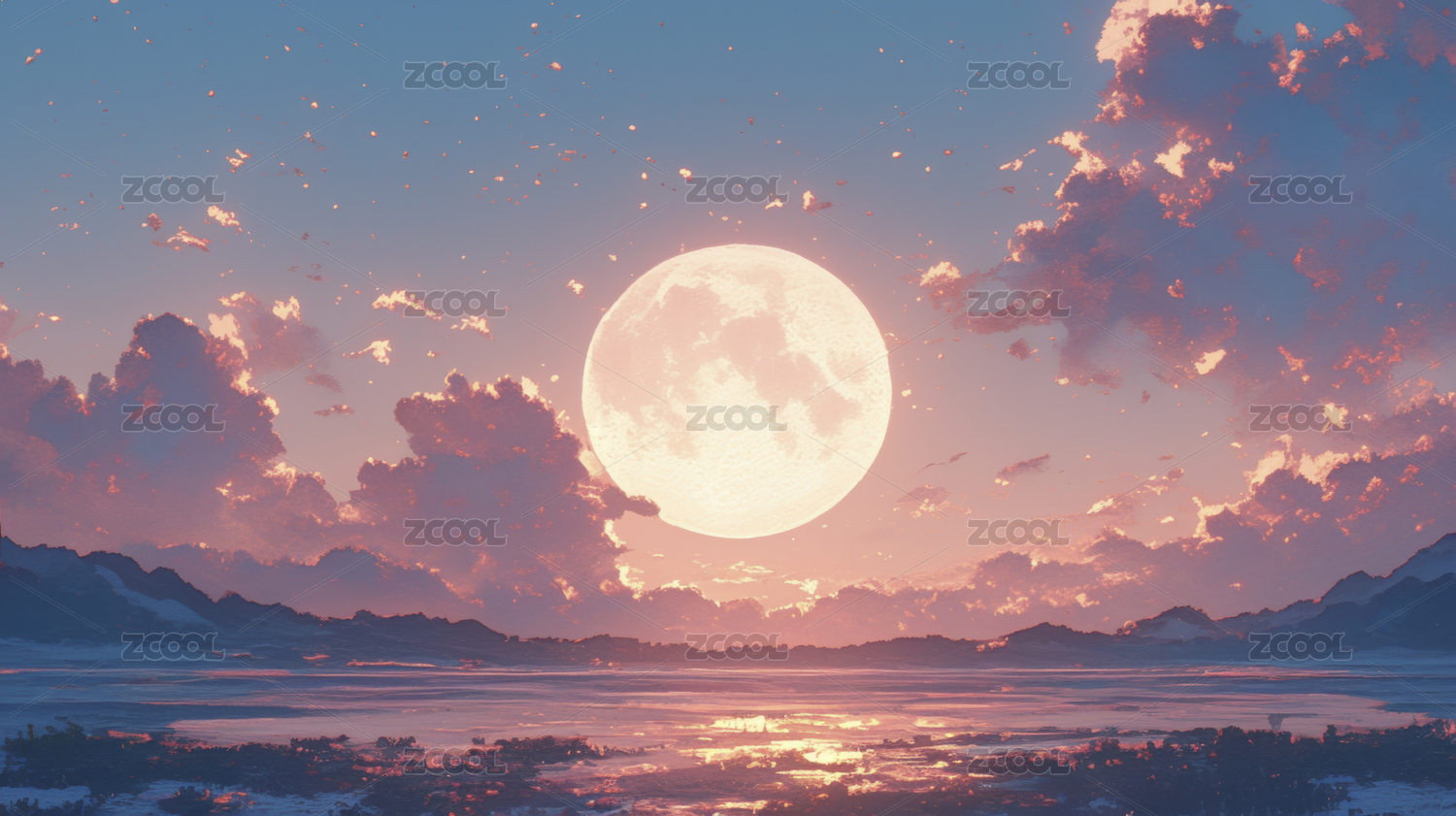 粉色月亮云海唯美日落