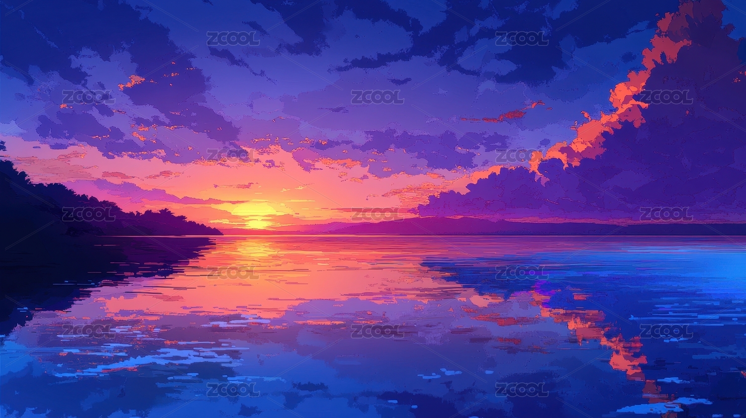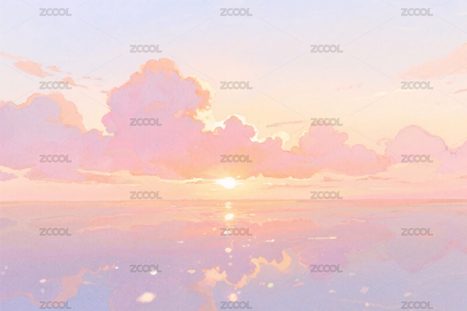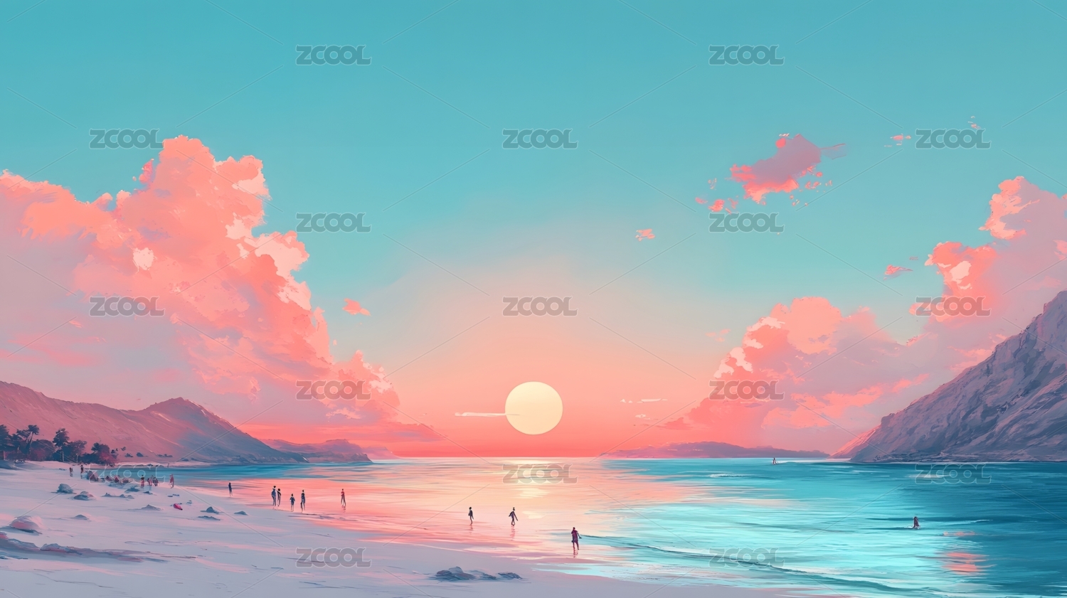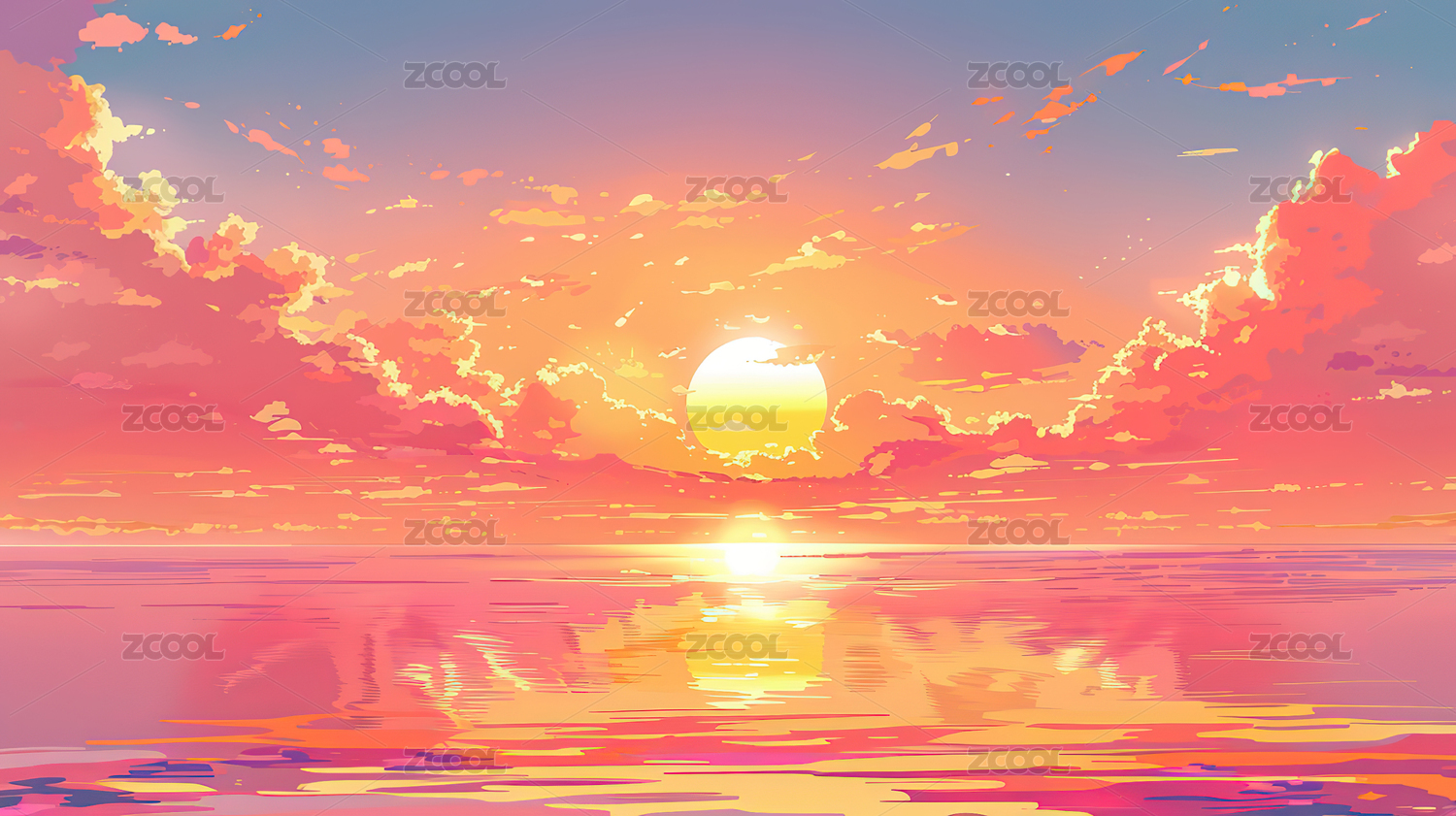梦幻日落海景插画
