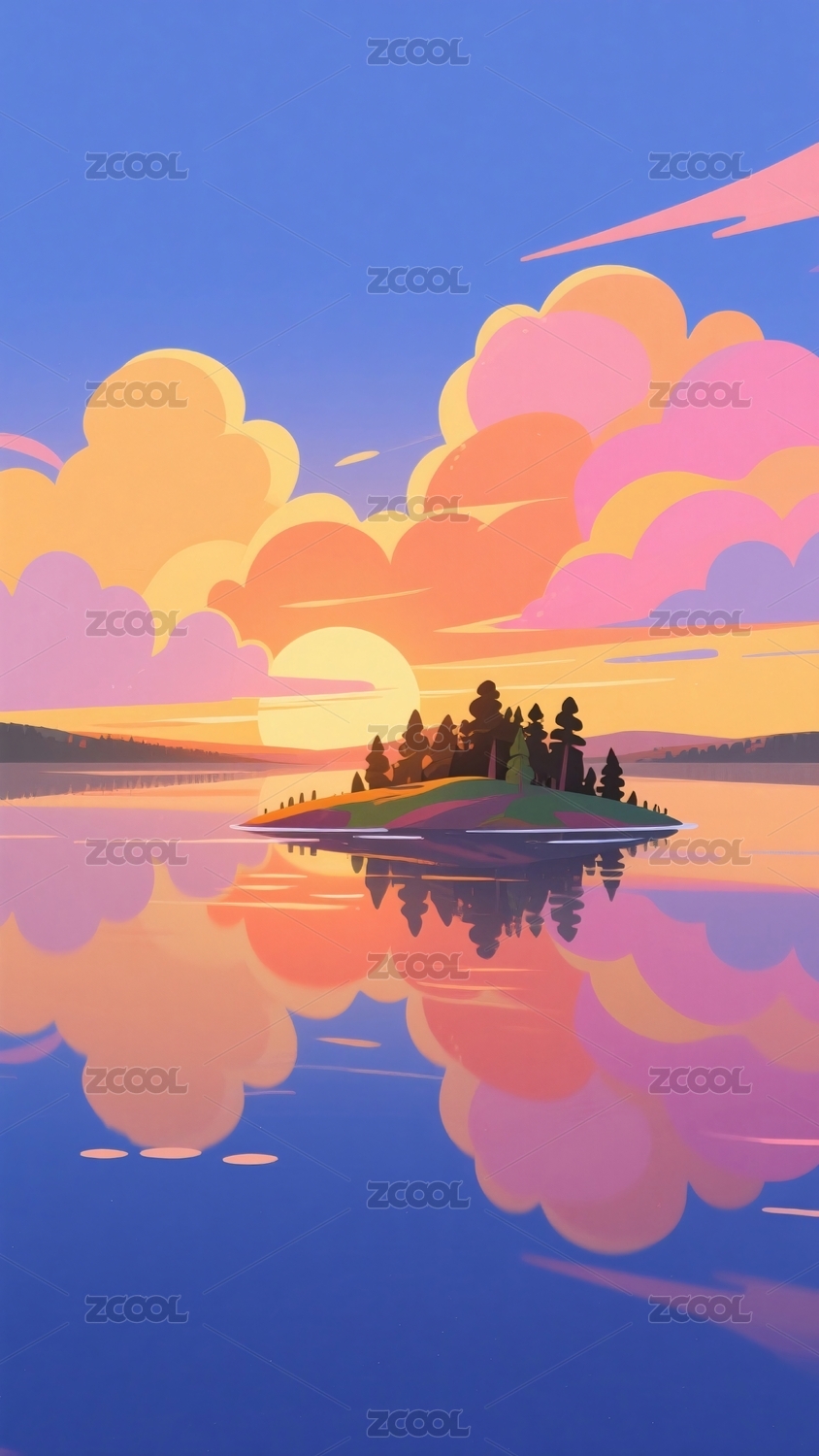 山和湖风景插画抽象艺术装饰画手机端海背景