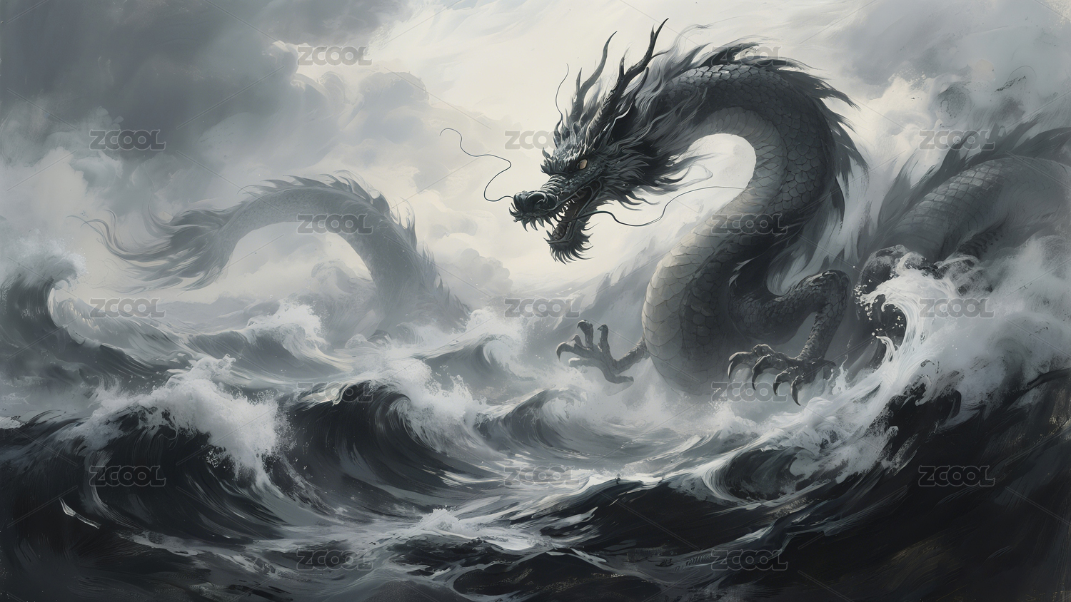光芒,龙,海浪,太阳,山,宫殿,飞鸟,云,岩石,波浪