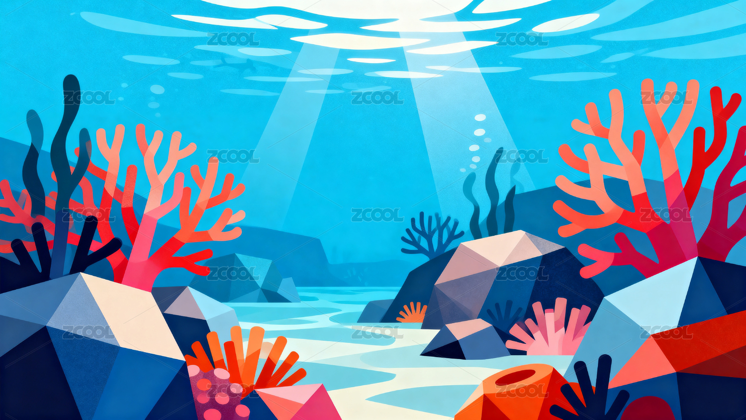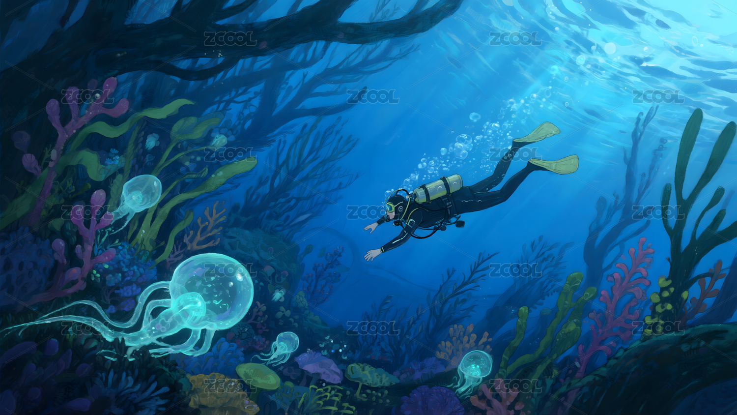 潜水员在海洋里潜水珊瑚水草世界海洋日插画