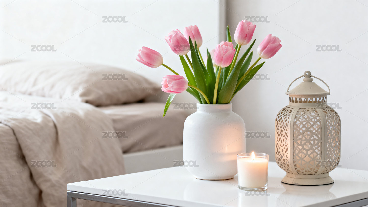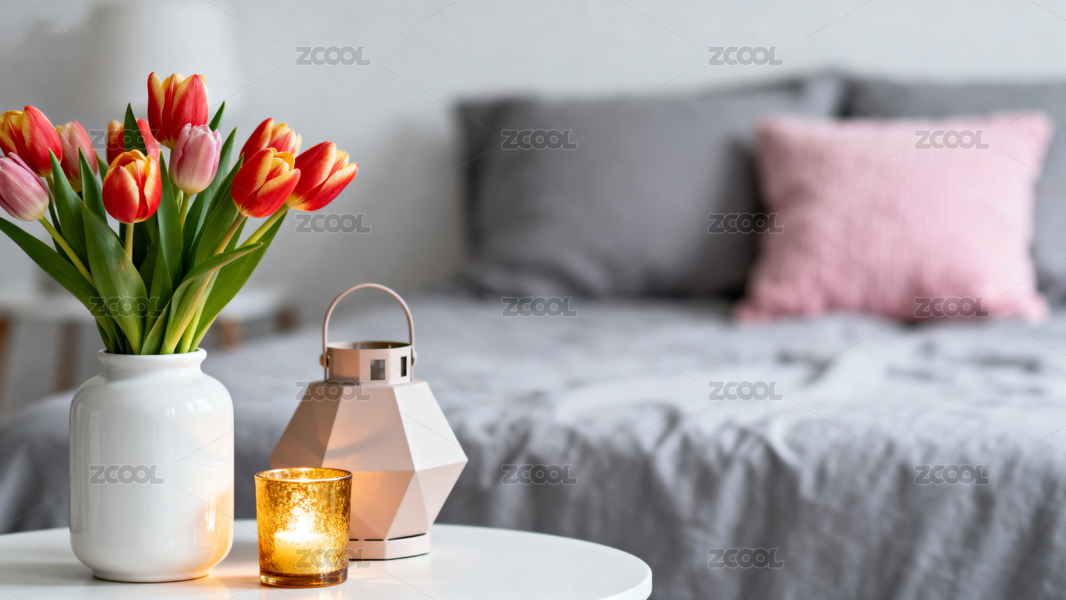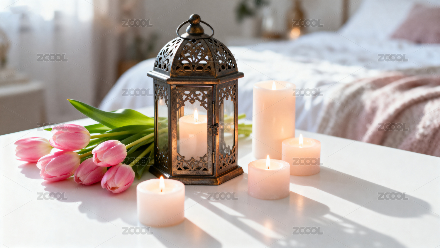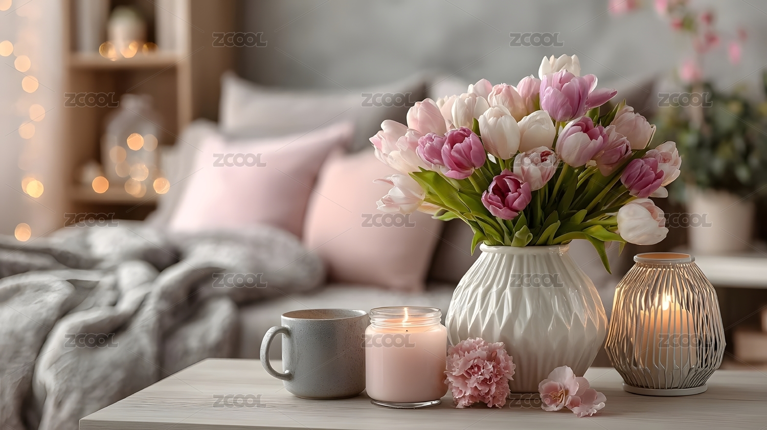 粉色郁金香与烛光营造温馨卧室氛围