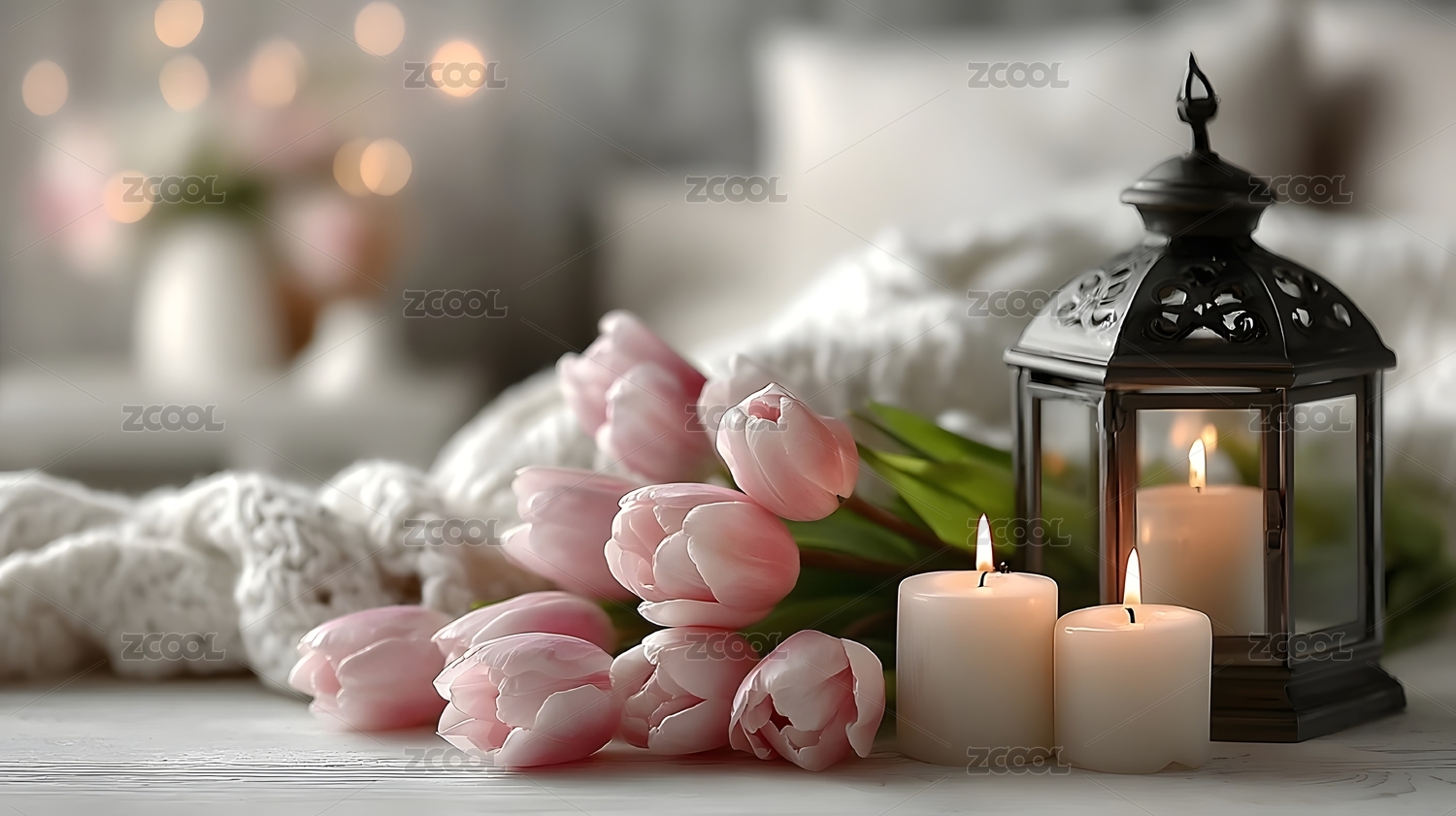 烛光与郁金香营造温馨桌面氛围