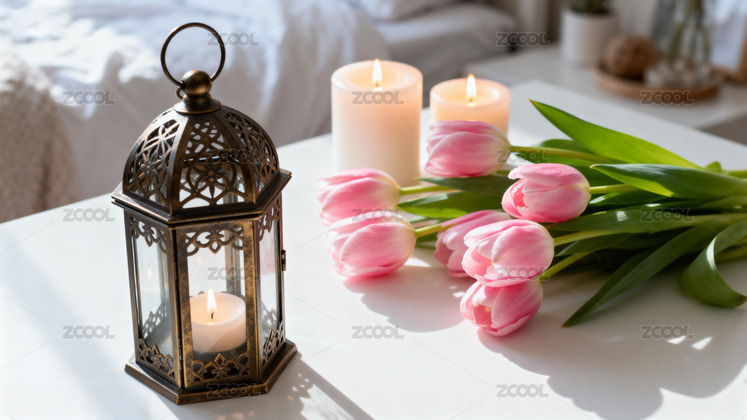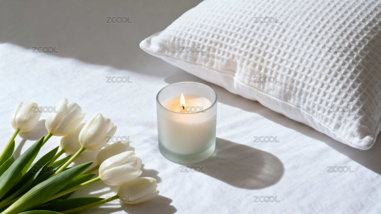 床铺上的白色郁金香与点燃蜡烛