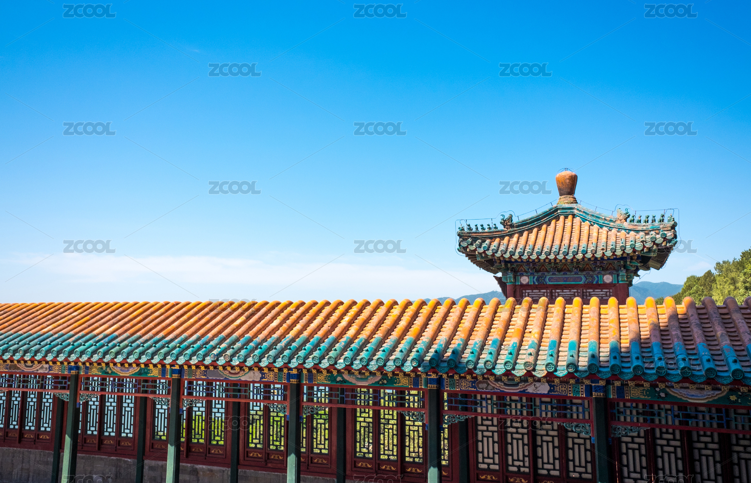 秋天蓝天下的北京颐和园公园的古宫殿建筑