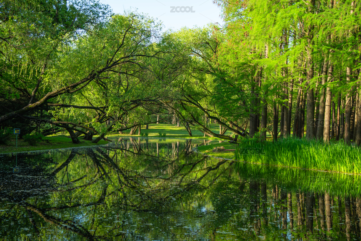 夏天公园里遮天蔽日的绿色树木与湖水