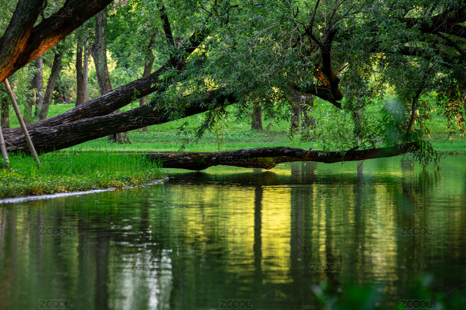 暮色浸染上海共青森林公园,湖面如镜映夏绿