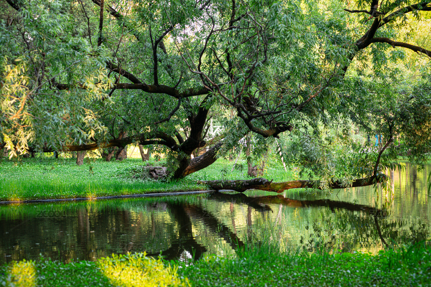 暮色浸染上海共青森林公园,湖面如镜映夏绿