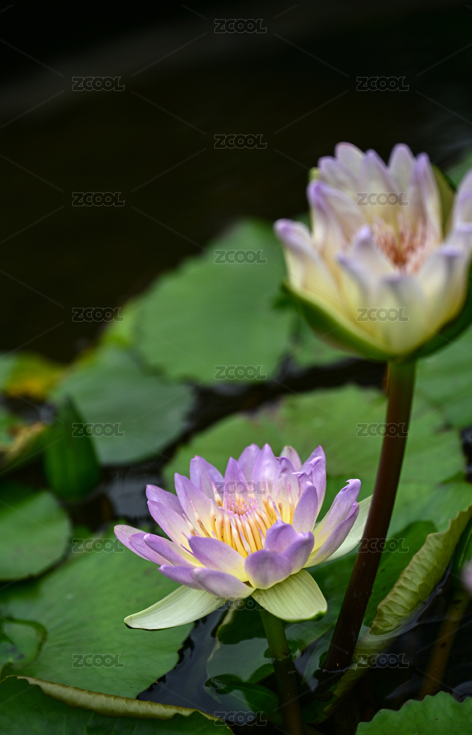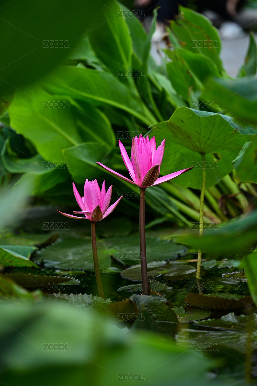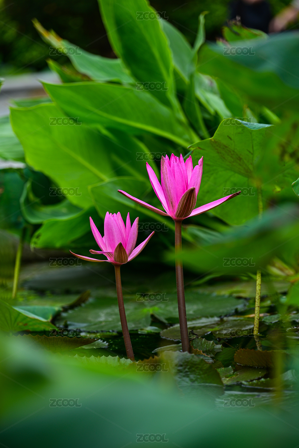 盛开的紫红色睡莲倒映在池塘宁静的水面