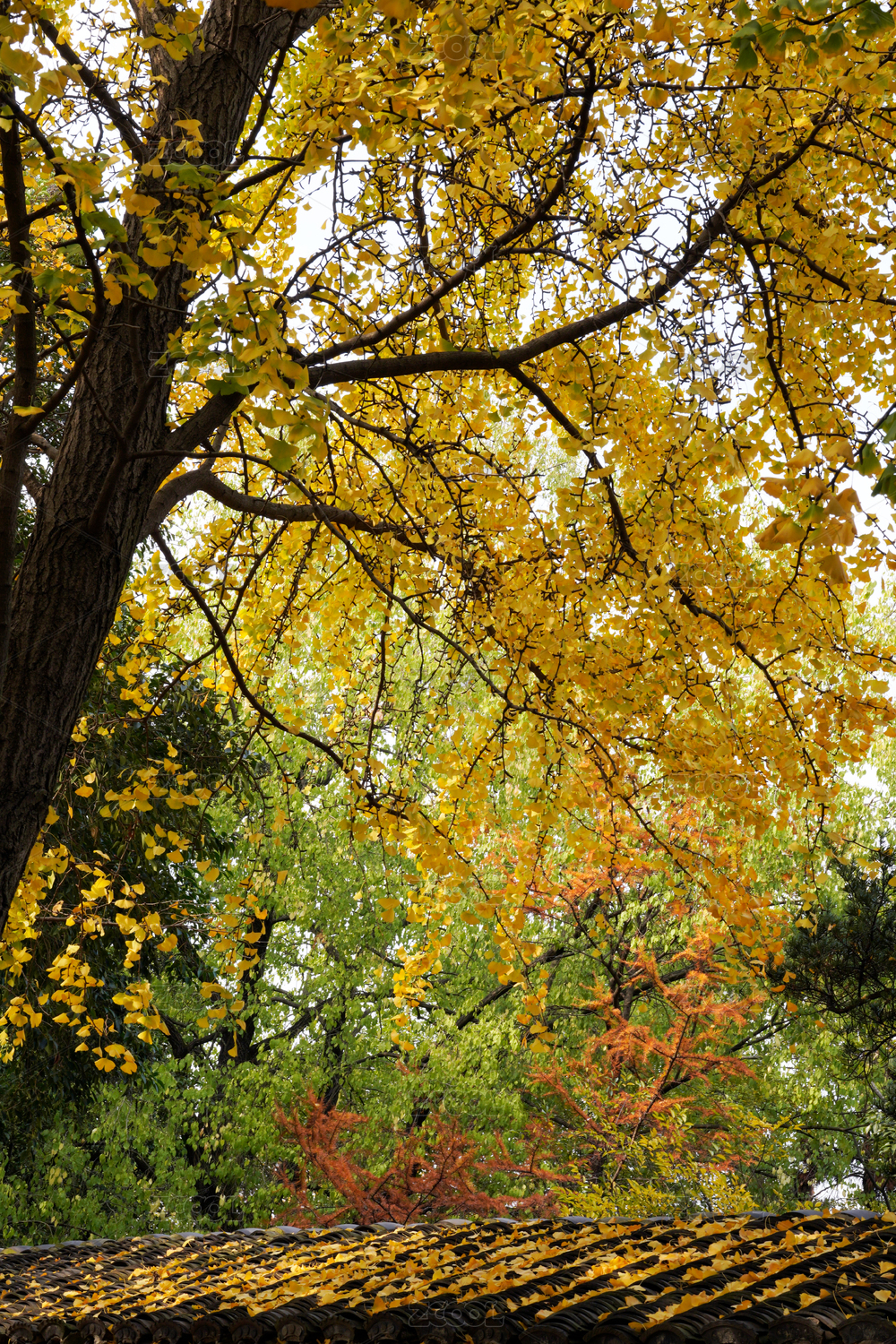 山东济南淌豆寺秋天黄色千年银杏树叶子金黄