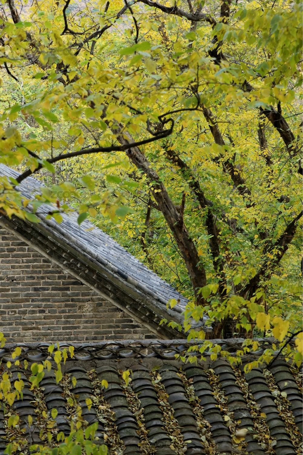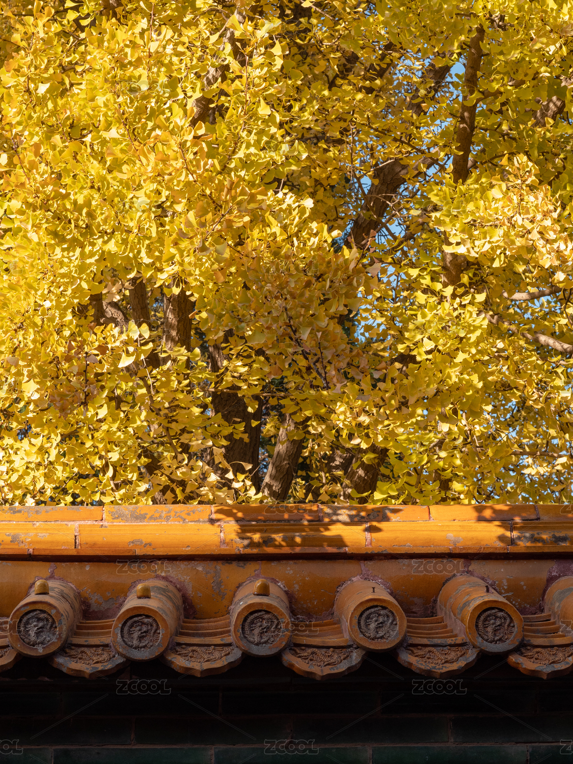 秋天季节瓦屋旁金黄色的银杏树叶子